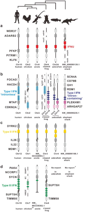 图1.脊椎动物IV型(a)和I型(b)、II型(c)和III型(d)干扰素的基因共线性分析