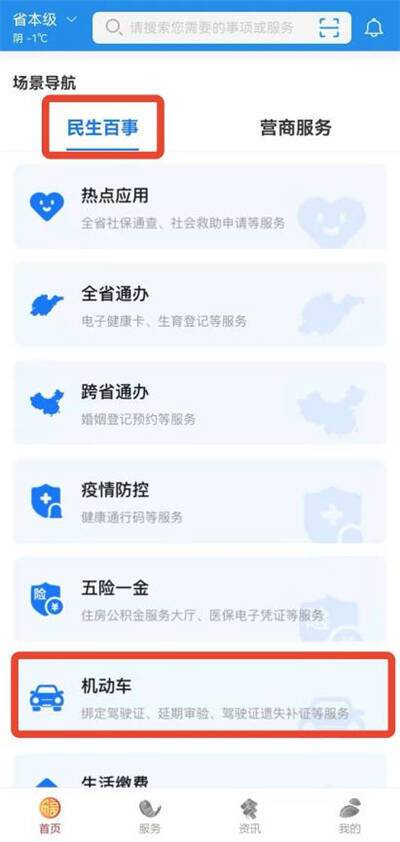 1.打开"爱山东"APP,在首页【民生百事】栏目中找到【机动车】专区。