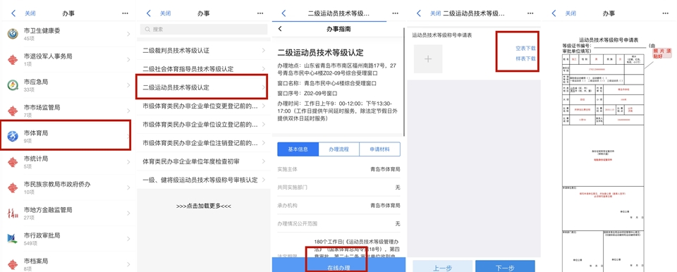 申请人只需下载“爱山东·青e办”APP,在线申请办理即可完成所有办理环节,实现了等级证办理的“零跑腿”和“指尖办”。认证申请只需操作三步。首先,在“爱山东·青e办”APP首页办事页面中找到市体育局,选择一级、健将级运动员或二级运动员技术等级认定办事事项点击进入,或在APP首页直接搜索“运动员”关键词,选择所需等级认证办理。第二步,进入办事详情页后,点击“在线办理”,根据提示下载“运动员技术等级称号申请表”,按照样表填写完成后,点击上传,即可进行等级称号认定申请。