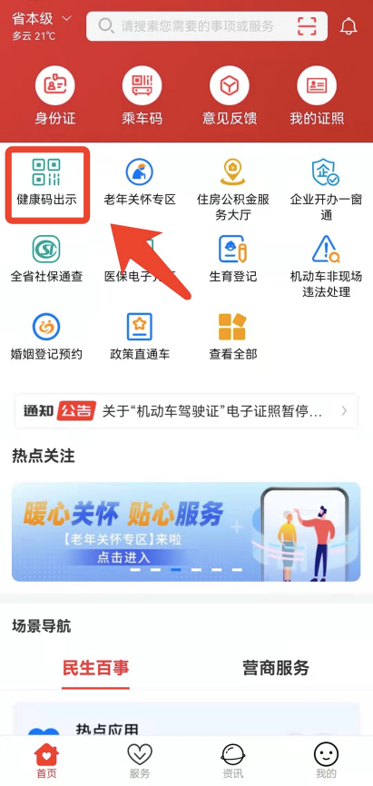 (2)在“爱山东”首页即可一键点击进入【健康码出示】,亮码更方便(详见图3)。