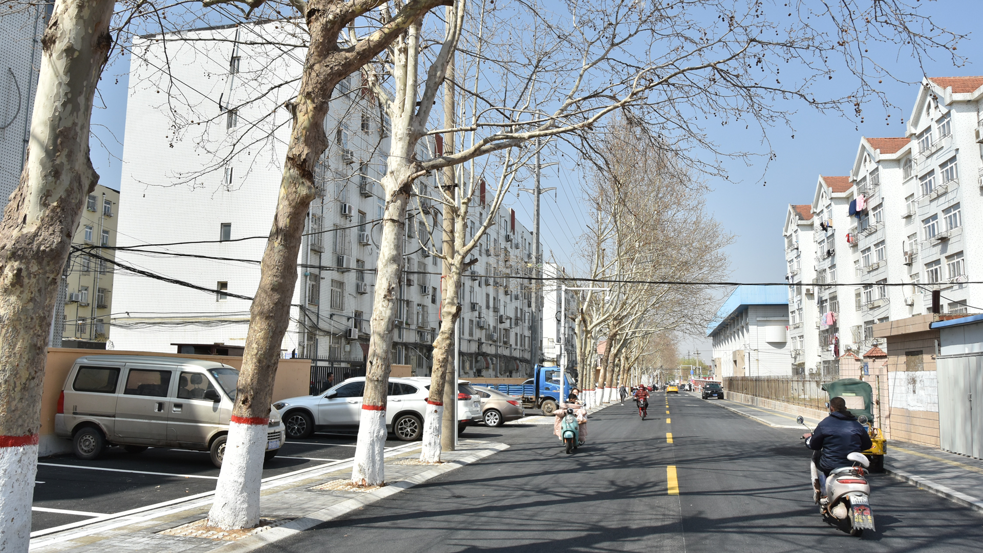 道路硬化后新划停车位,粉刷外墙