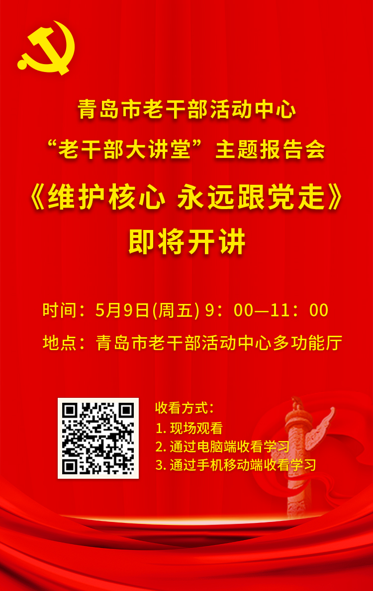 青岛新闻网5月5日讯 为深入贯彻学习党的十九届六中全会精神,推动全市离退休干部和老干部工作者深入学习习近平新时代中国特色社会主义思想,2022年5月9日(周一)上午9:00,青岛老干部活动中心以“互联网+党课”教育模式,特别邀请青岛开放大学原副校长(正局级)、青岛市关工委“五老”宣讲团团长王继军,线上线下同步推出“老干部大讲堂”《维护核心 永远跟党走》主题报告会,一同围观!直播 |“老干部大讲堂”《维护核心永远跟党走》主题报告会>>>