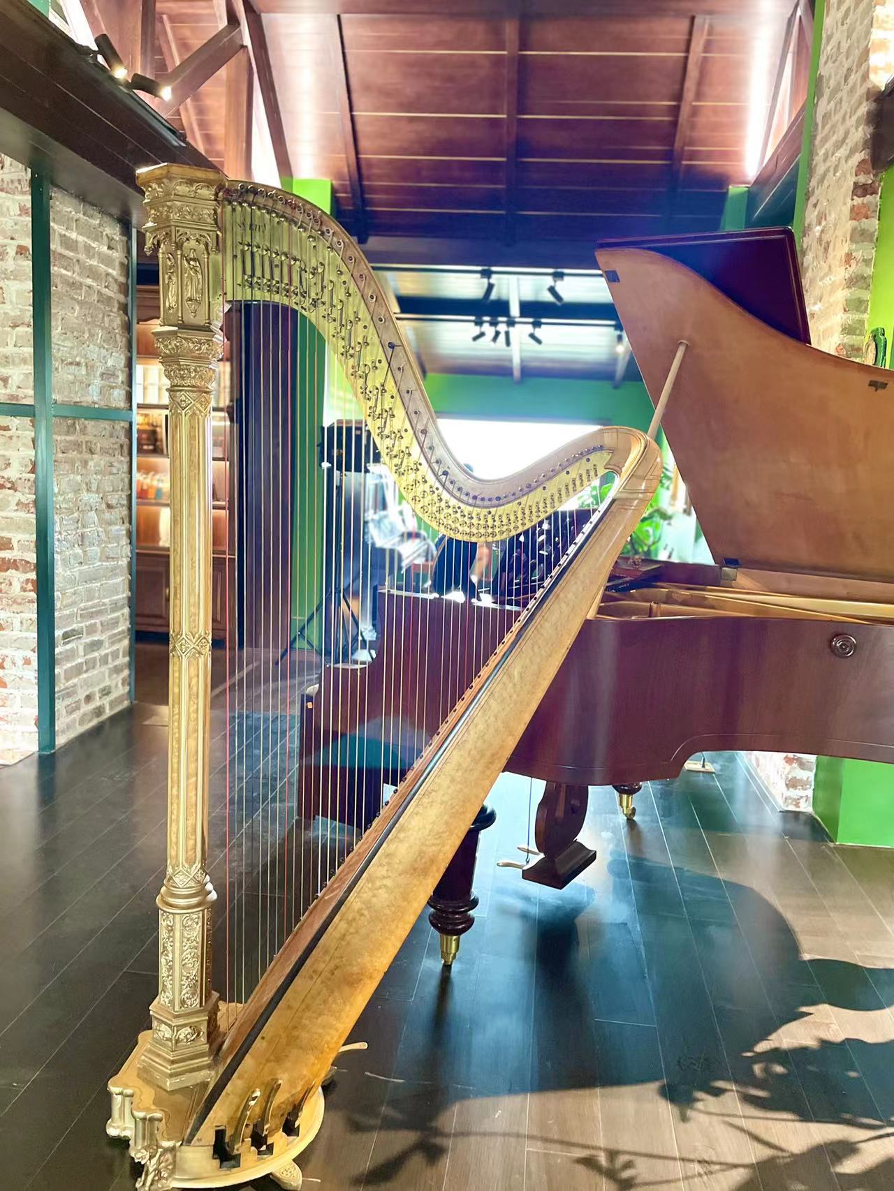 竖琴、钢琴,复古的灯饰和地板,都有种穿越的感觉,站在户外露台可以欣赏到部分青岛老城区的街景,坐在靠窗的卡座,感受老城区的静谧,真的不错。