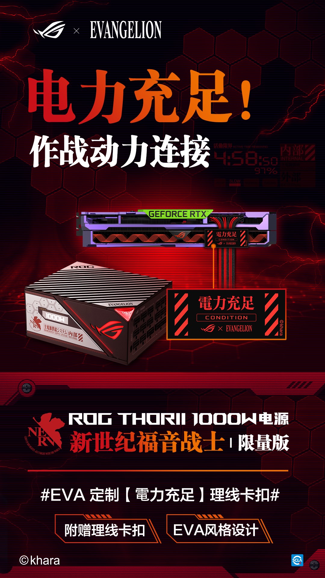 为保障整套ROG×EVA全家桶的战力释放,能源核心方面选用的ROG THOR II 1000W电源新世纪福音战士丨限量版。这款电源在OLED显示屏上可谓下足了功夫,其开机动画结合了动漫中使徒来袭时的紧急情况提示、同步率和EVA电量显示等众多元素,充分结合动漫主题内容与电源整体设计调性进行了深度定制及整合。