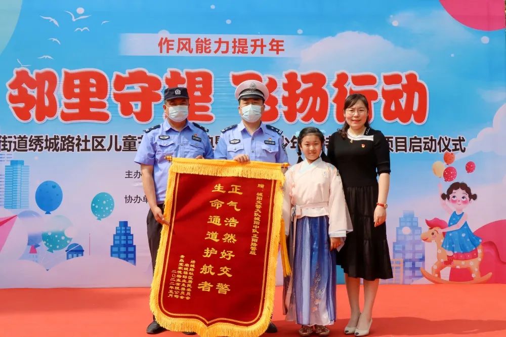 生命通道护航者,正气浩然好交警。城阳交警大队城阳中队,甘于奉献、执着坚守,日复一日、年复一年的为绣城路社区的孩子们创造安全的交通环境、为孩子们的安全保驾护航。为此,绣城路社区、宜家德物业及业委会特意定制一面锦旗,社区副主任国德鑫同志和社区青少年代表共同为城阳中队送上锦旗,以表达深深的感谢!