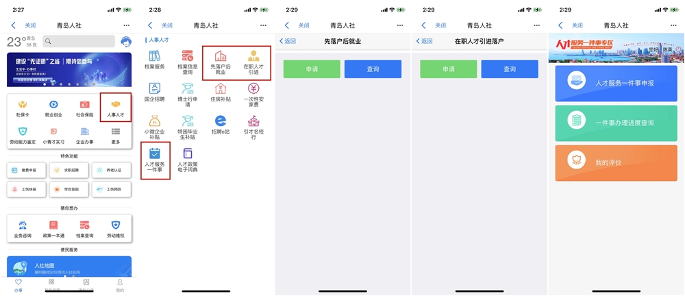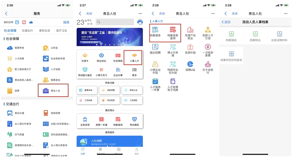 3.进入“青岛人社”,在“人事人才”栏目下,选择“档案服务”,可进行档案接收、档案转出、出具材料证明、档案所在机构查询。