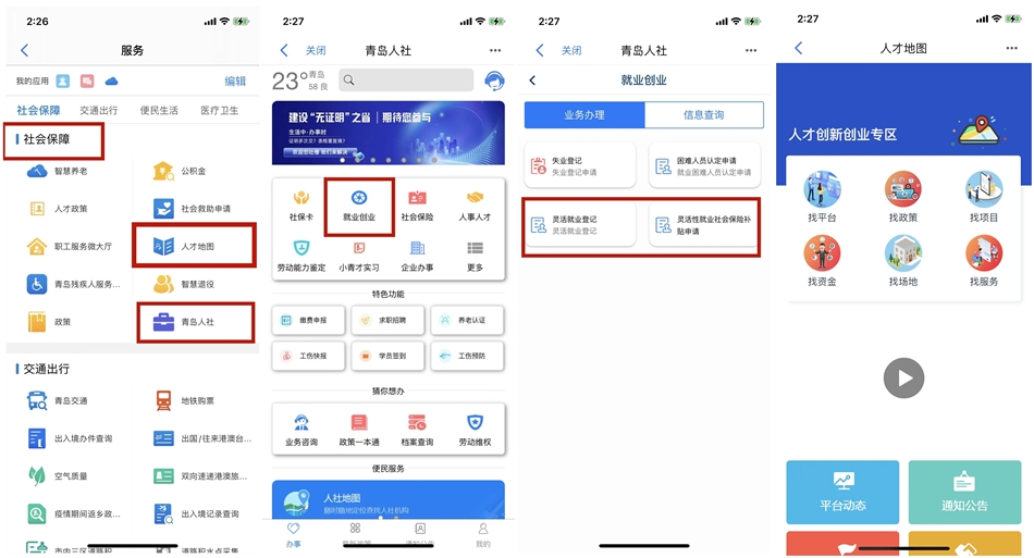 2.进入“青岛人社”,在“就业创业”栏目下,可根据具体情况选择“灵活就业登记”、“灵活就业社会保险补贴申请”功能进行登记操作。