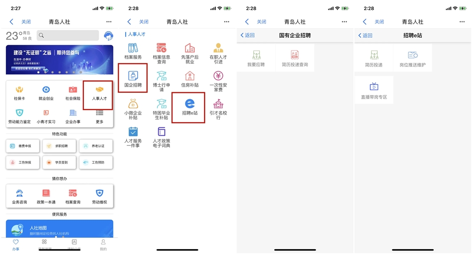 2.进入“青岛人社”,在“人事人才”栏目下,选择“国企招聘”可查询国企招聘信息,选择“招聘e站”,可进行简历投递、岗位推动维护等操作。