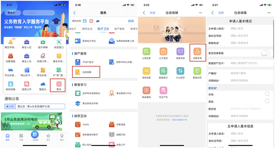 申请步骤如下。在“爱山东·青e办”APP首页点击“更多”,在“房产服务”分类下,找到“住房保障”服务,点击进入。点击进入后,在业务办理页面选择“资格申请”点击进入,在申请人基本情况页面根据真实情况填写相关信息并提交。申请提交后,如需查看审核结果,可点击“审核进度”进行查看。除住房保障资格申请服务外,还可查看公示公告信息、计分排序、配租合同及配租登记、租金缴纳等操作。