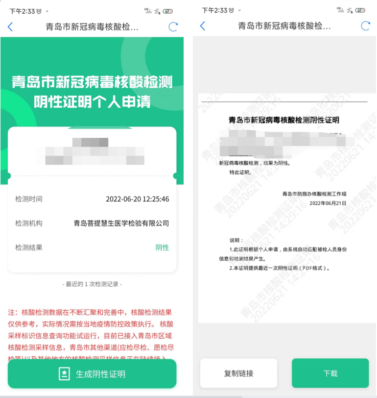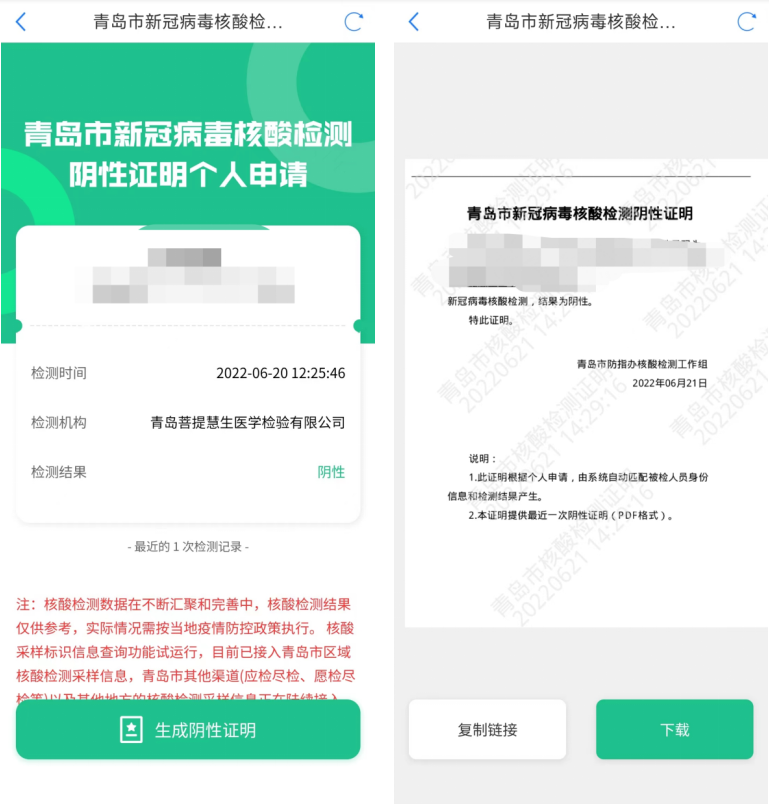 为方便市民更方便的获取核酸检测阴性证明,市大数据局紧跟数字青岛建设要求以及“作风能力提升年”工作部署,上线“青岛市新冠病毒核酸检测阴性证明个人申请”服务,市民可在采样点完成核酸检测后,通过“核酸阴性证明”应用自行查看下载最近一次核酸阴性证明报告,无需再前往采样点现场打印,即可自行进行核酸报告的查看下载。根据青岛市防指办最新工作要求,除国务院联防联控机制和省委领导小组(指挥部)等有明确规定之外,青岛市核酸检测阴性证明与核酸检测报告(电子版和纸质版)具有同等效力,可以作为青岛市范围内核酸检测结果查验凭证。