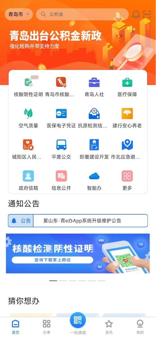 1、打开“爱山东·青e办”APP,点击APP首页的核酸检测证明应用,即可自动查询核酸检测阴性证明。