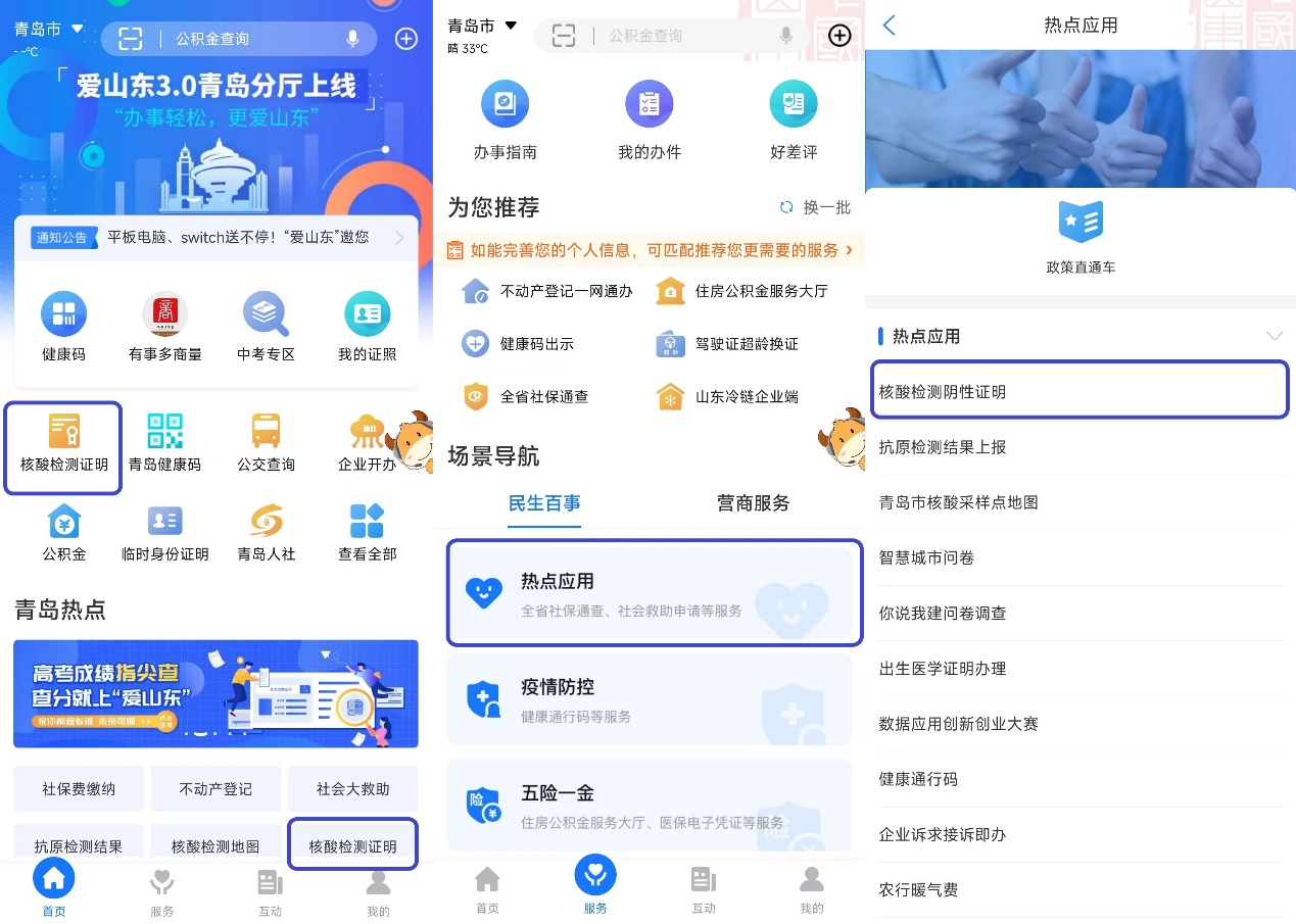 1、打开“爱山东”APP,在首页直接进入,或通过“服务-民生百事-热点应用”进入“核酸检测阴性证明”应用。