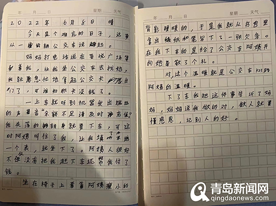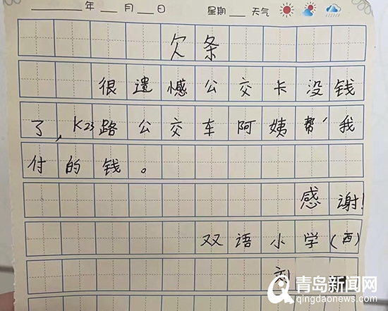 原来,在小刘来之前,妈妈周女士便向第四分公司拨打了一通表扬电话,事情的起因是周女士在女儿小刘的日记中发现了一个感人的故事。6月8日,小刘独自乘坐K23路公交车到吾悦广场车站找妈妈,但上车打卡时自己的学生卡响起了“余额不足,请及时充值”的提示音。小刘身上没有带钱,尴尬的转身想要下车时,驾驶员崔慧叫住了她:“小朋友,快上车坐好吧,回家不要忘记让妈妈帮你充卡呀。”小刘点点头,一边谢过善良的驾驶员阿姨,一边找座位做好。路上,小刘看着驾驶员阿姨拿出一张公交卡帮助自己支付了一元车费,便从作业本中撕下一页,写下了一张“欠条”,还留下了自己对驾驶员阿姨的感谢。下车时,小刘将“欠条”交到了驾驶员阿姨手中,并敬了一个少先队礼,表示感谢。