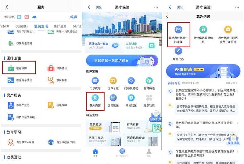 完成异地就医备案是参保人在外地因意外临时就医要做的必备步骤。参保人可通过“爱山东·青e办”APP内的医疗保障服务办理。参保人下载注册“爱山东·青e办”APP后,只需两步即可掌上完成异地就医备案。首先,在“爱山东·青e办”APP首页顶端搜索栏搜索“医疗保障”应用或在首页依次点击更多-医疗卫生-医疗保障;然后,在医保常用的“意外伤害”分类下,找到“异地意外伤害住院备案”,根据提示填写相应信息后,即可办理相应备案手续。