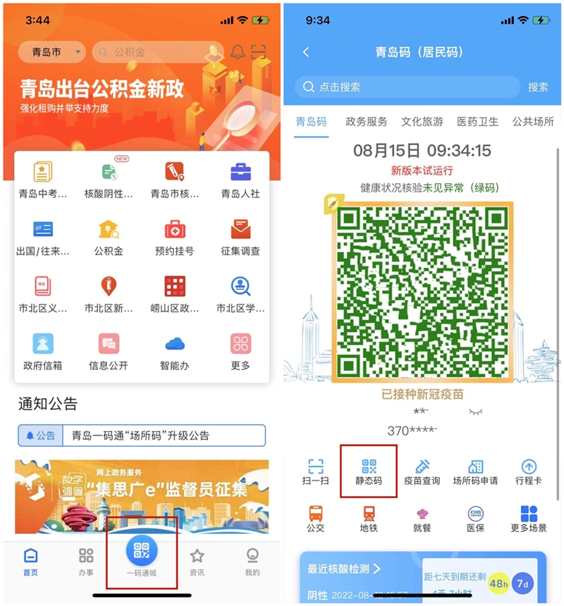 市民可在“爱山东·青e办”APP首页点击底部“一码通城”,线上领取使用“青岛码”。老年人、中小学生、婴幼儿等不便使用智能手机的特殊群体,可以直接打印使用“青岛码静态码”,通过展示实体二维码的方式进行身份认证和场所登记,满足老人和孩子的出行、办事需求。