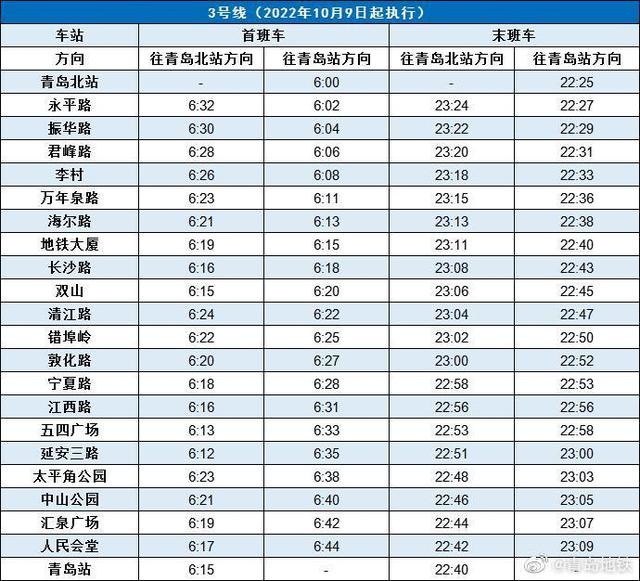 3号线——青岛站首班车时间调整至6:15,末班车时间调整至22:40;青岛北站首班车时间调整至6:00,末班车时间调整至22:25。