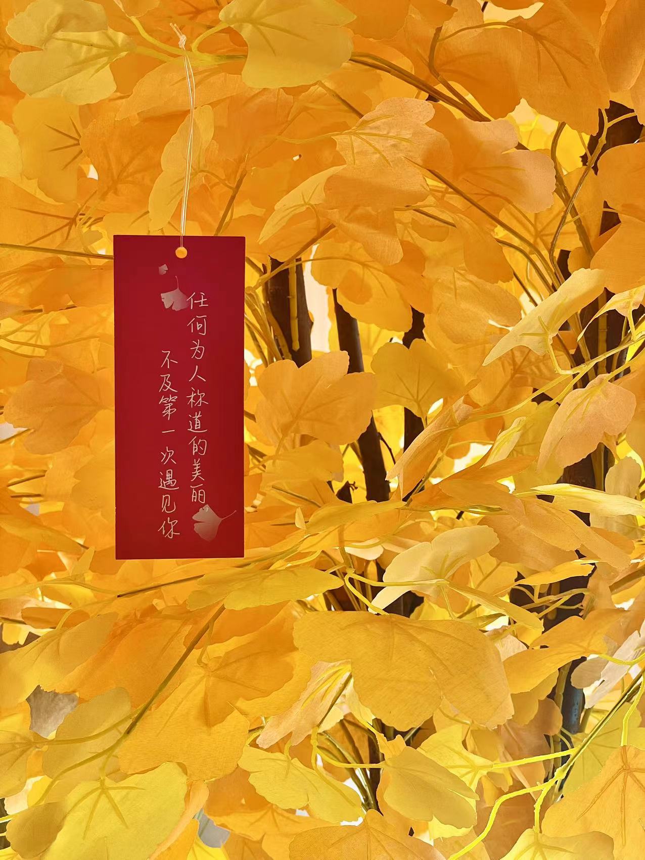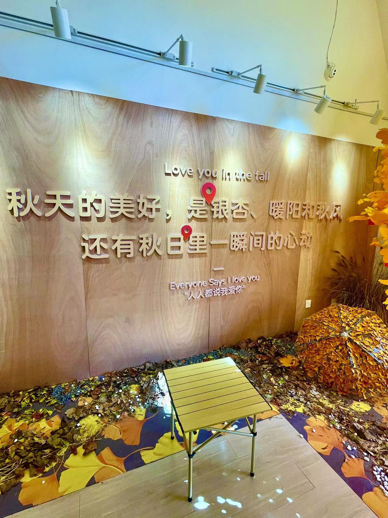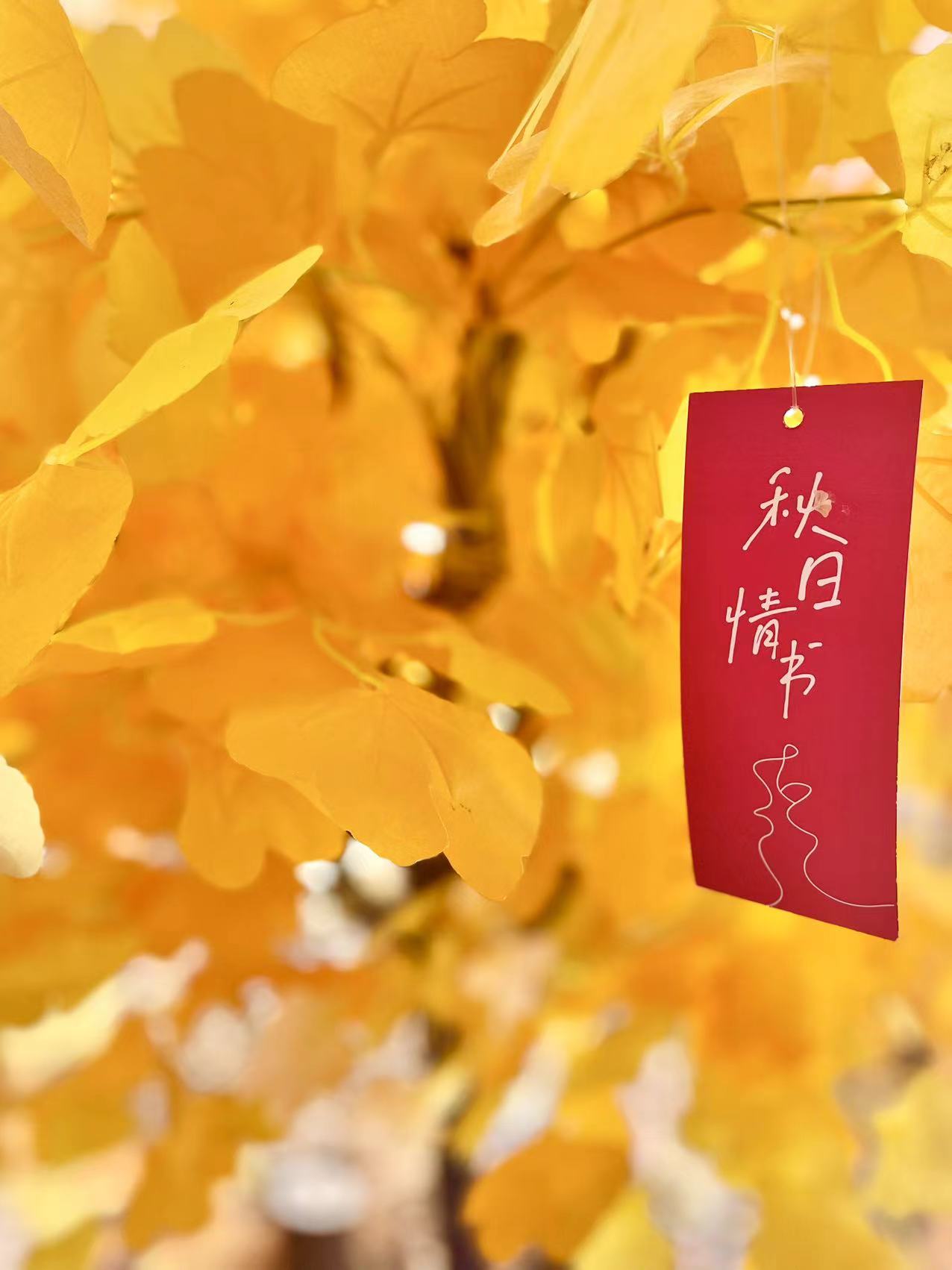 散落在各处的“秋日情书”,“我在秋天说爱你”、“秋天的银杏与温柔同在 正如你与我依旧相拥”、“我在秋日贩卖浪漫”、“一起踩树叶吗”......浪漫的字句让原本寂寥的秋季添了许多生机与活力。