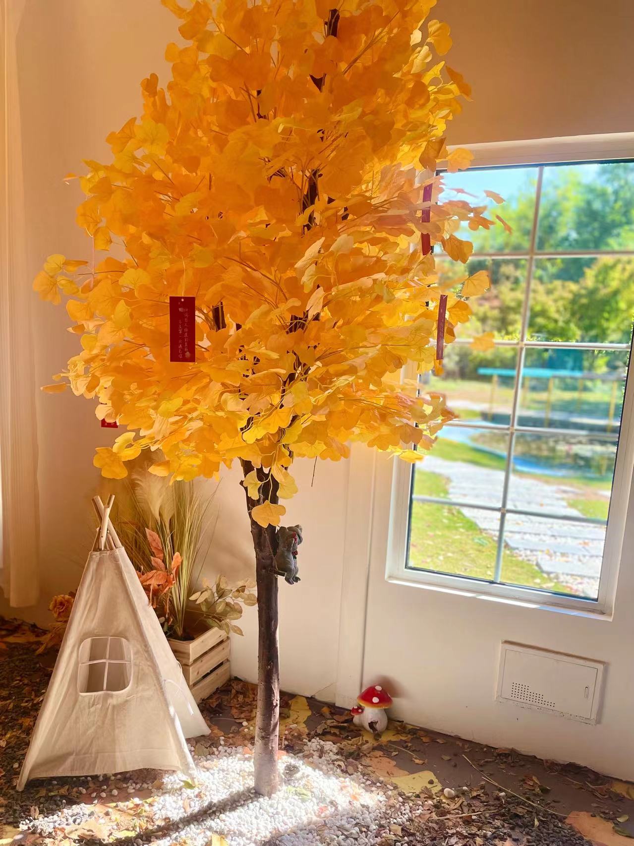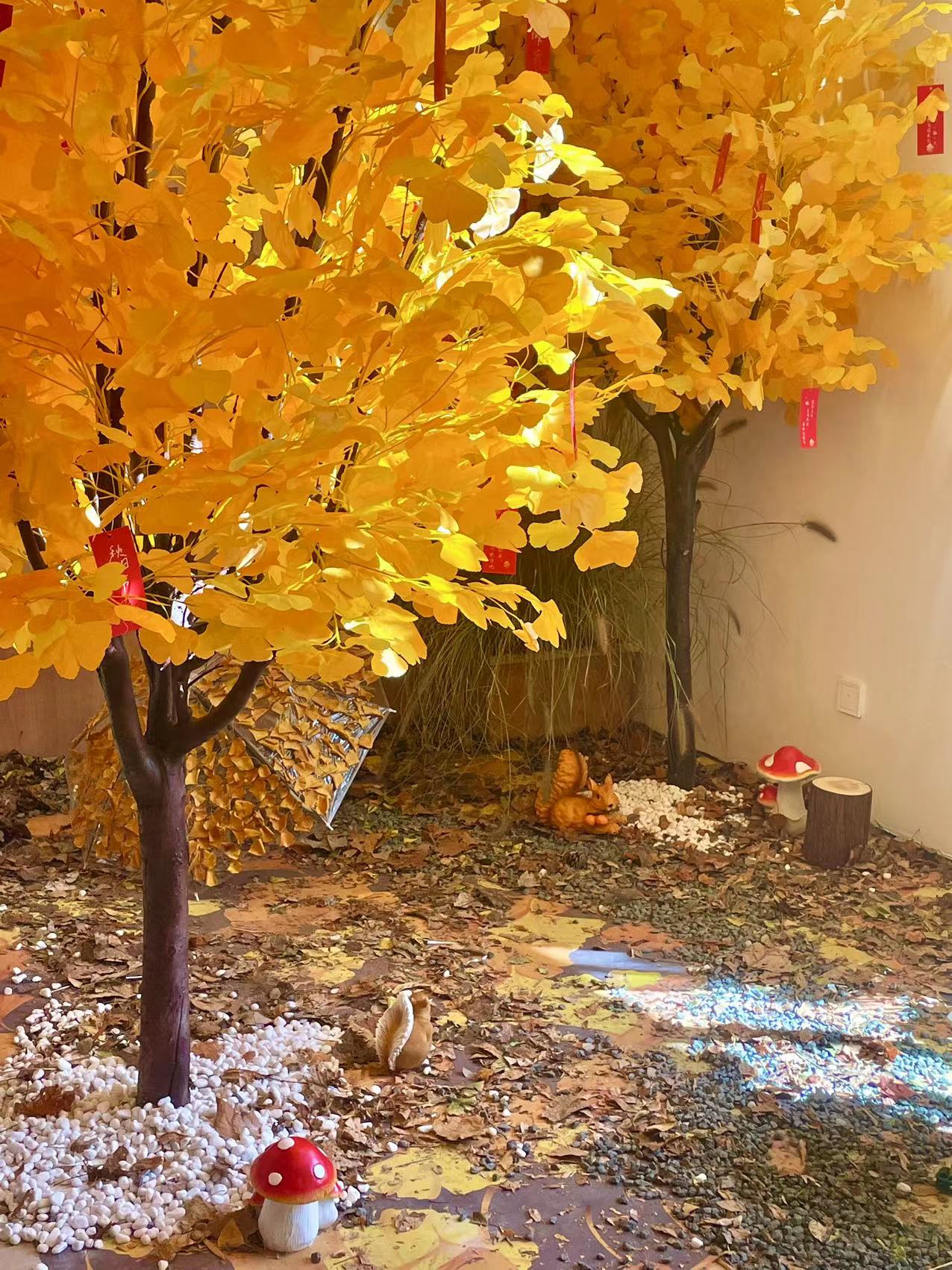 看似小小的一方天地,却是别有洞天。贴满树叶的雨伞、柴火、松鼠......场景布置的很有新意,很适合拍照打卡。尤其是靠窗的布景,有种欧洲秋日的感觉,很像七八十年代挂历上的风景画。