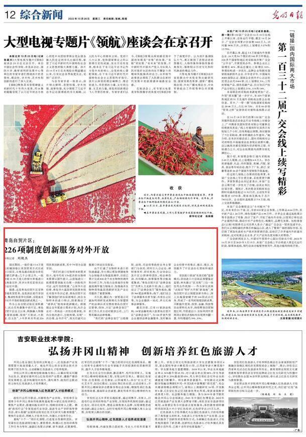 齐鲁网·闪电新闻10月26日讯 10月26日,《光明日报》12版以《青岛自贸片区:226项制度创新服务对外开放》为题,点赞青岛自贸片区积极融入和服务国家战略。以下为报道全文:
