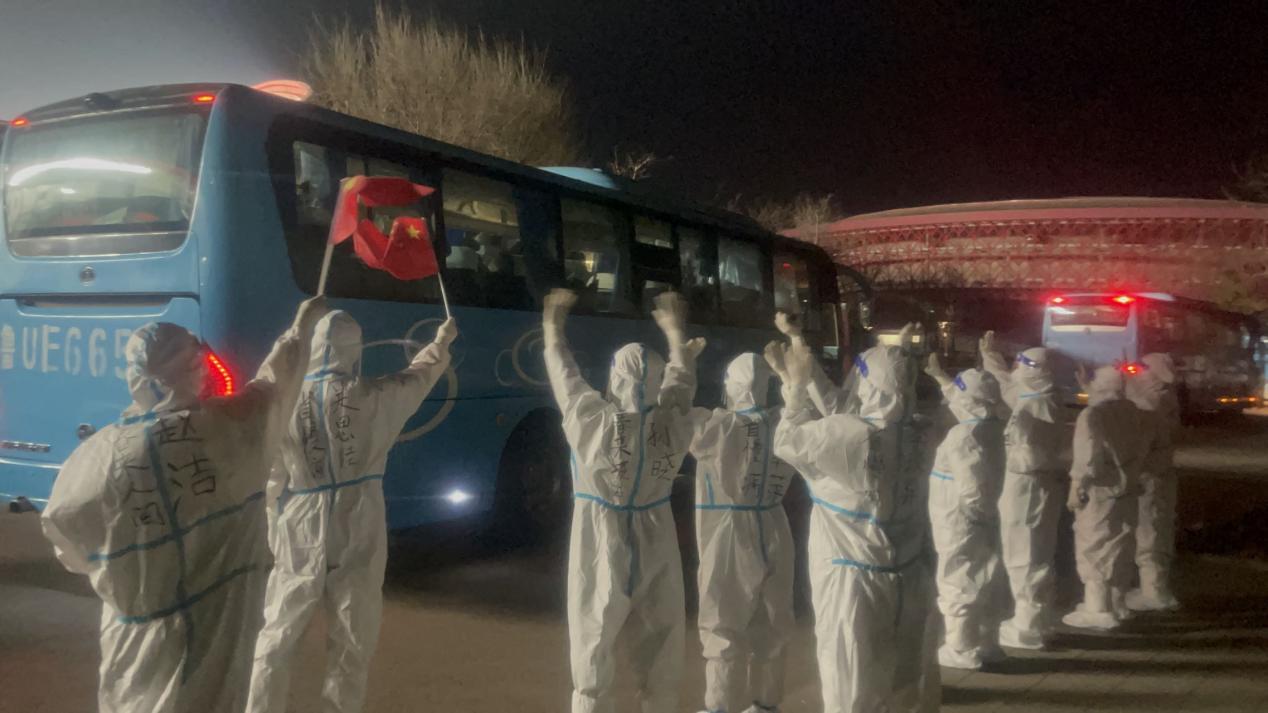 到达莱西的第二天,第一次进入方舱区域,因为和已有的方舱医院工作模式不同,没有模板可以参照,具体工作必备的物品都没有配齐。经过两天的实地勘察,讨论分析,建章立制,院感培训,迎着突降大雪一趟又一趟地搬运,在队伍的不懈努力下,方舱内的抗疫流程初现雏形,物资基本到位,可以说是实现了从无到有。查漏补缺、检查设施的当晚,我们迎来了方舱的首批隔离人员。为了避免防护服内的衣物过厚影响工作效率,即使是在雪后的寒夜里,医护人员防护服内都只穿着单层衣衫。突发疫情要求我们闻令而动,听令而行,接收隔离人员的工作在24小时中随时都有可能安排,方舱场内的探照灯彻夜长明。正是日常工作的磨炼,才有了现在自信自强、充满韧劲的精神风貌。