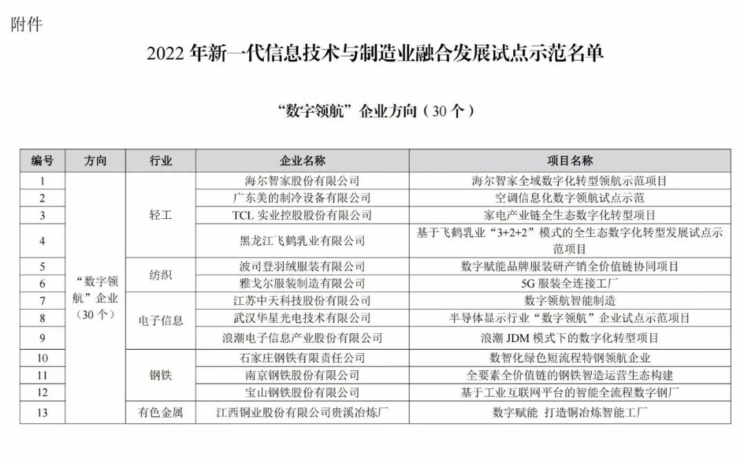 10月31日,工业和信息化部公示了2022年新一代信息技术与制造业融合发展试点示范名单。本次示范名单首次围绕“数字领航”方向遴选出企业30家,涉及轻工、纺织、电子信息、钢铁、有色金属、石化化工、建材、装备制造、汽车共九大领域。其中,海尔智家上榜且居榜首。