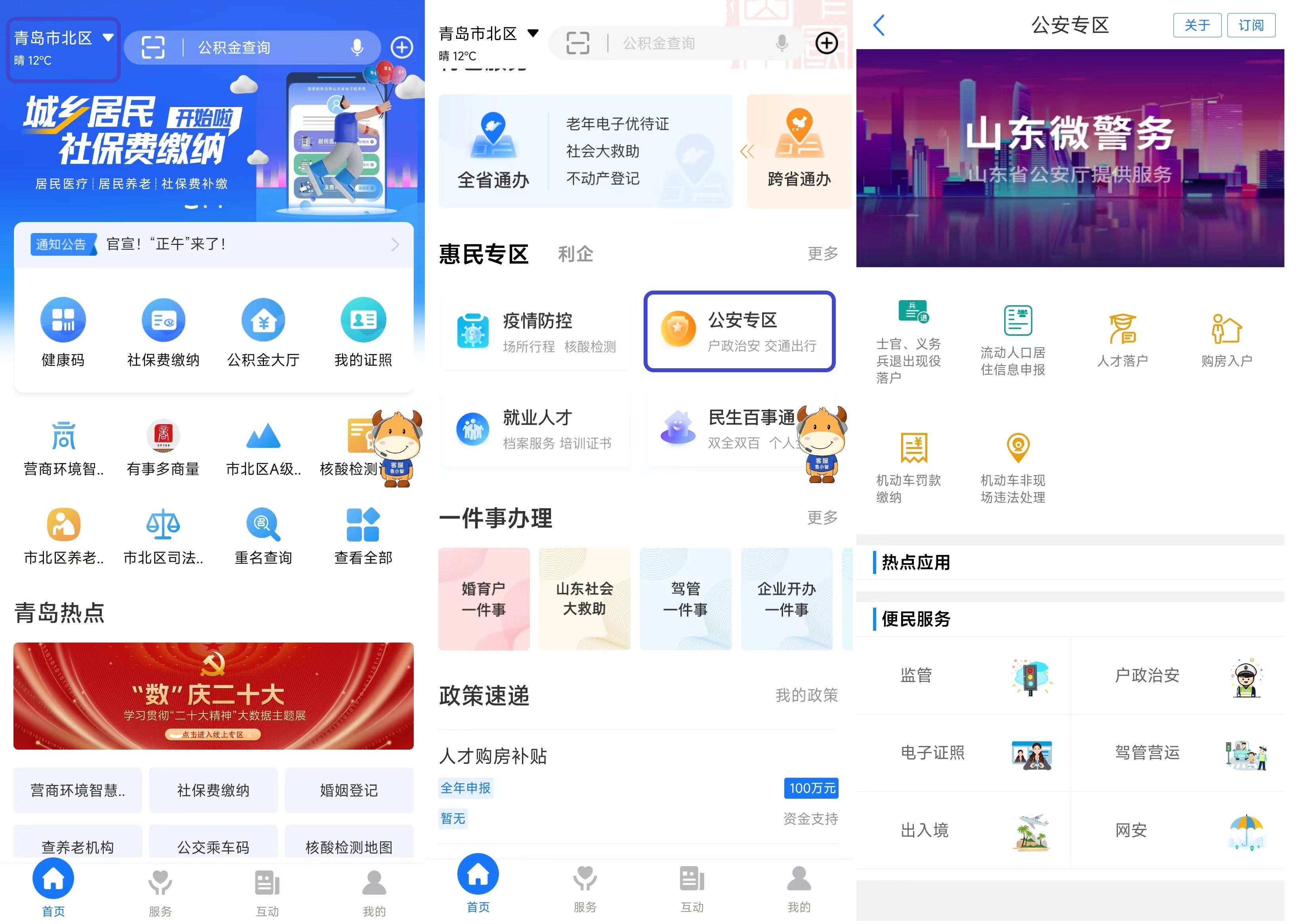 进入“爱山东”APP,切换至市北分厅,下滑找到公安专区即可使用。公安业务网上办,足不出户贴心享。