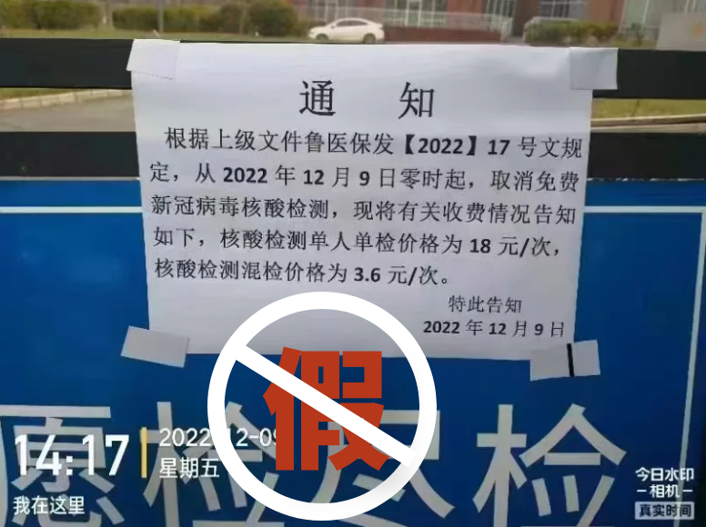12月9日,有一则网络流传的《通知》,宣称:“根据上级文件鲁医保发〔2022〕17号文规定,从2022年12月9日零时起,取消免费新冠病毒核酸检测,现将有关收费情况告知如下,核酸检测单人单检价格为18元/次,核酸检测混检价格为3.6元/次”。此信息为虚假信息,山东省医疗保障局及各市、县(市、区)医保部门均未发布此类内容。