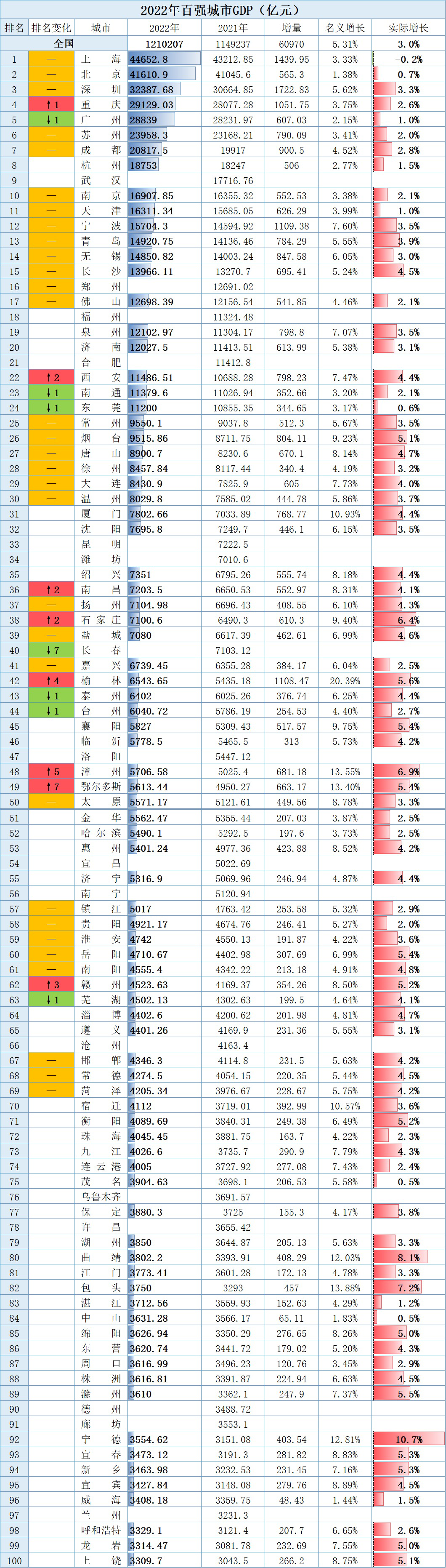 近段时间,国内城市陆续公布2022年全市生产总值成绩单。在2021年国内排名前15的城市中,除了武汉没有公布数据之外,其他城市都公布了2022成绩单。相比去年,除了重庆超越广州排名第四之外,前15名城市中,其他城市排名相比去年保持不变。