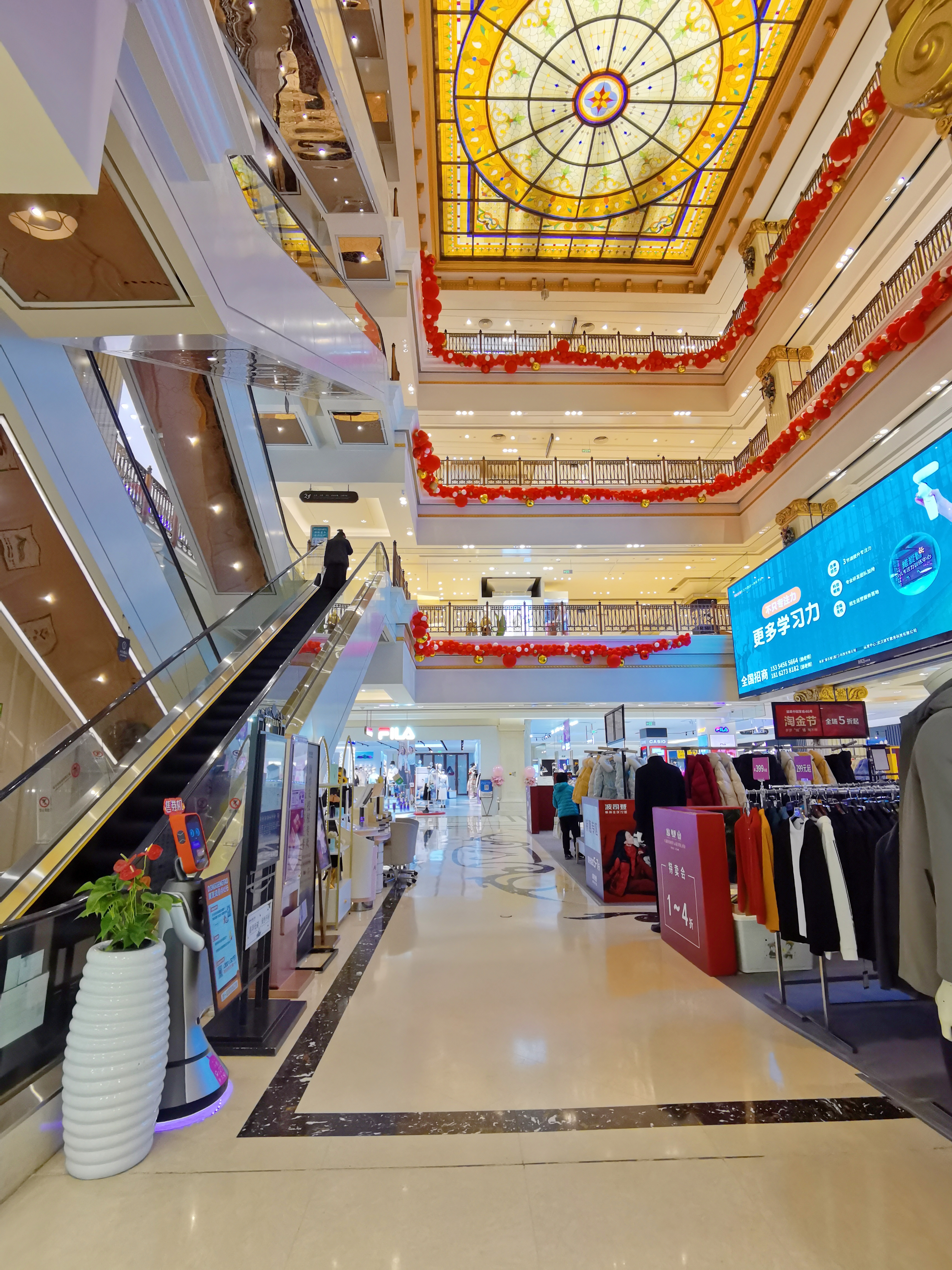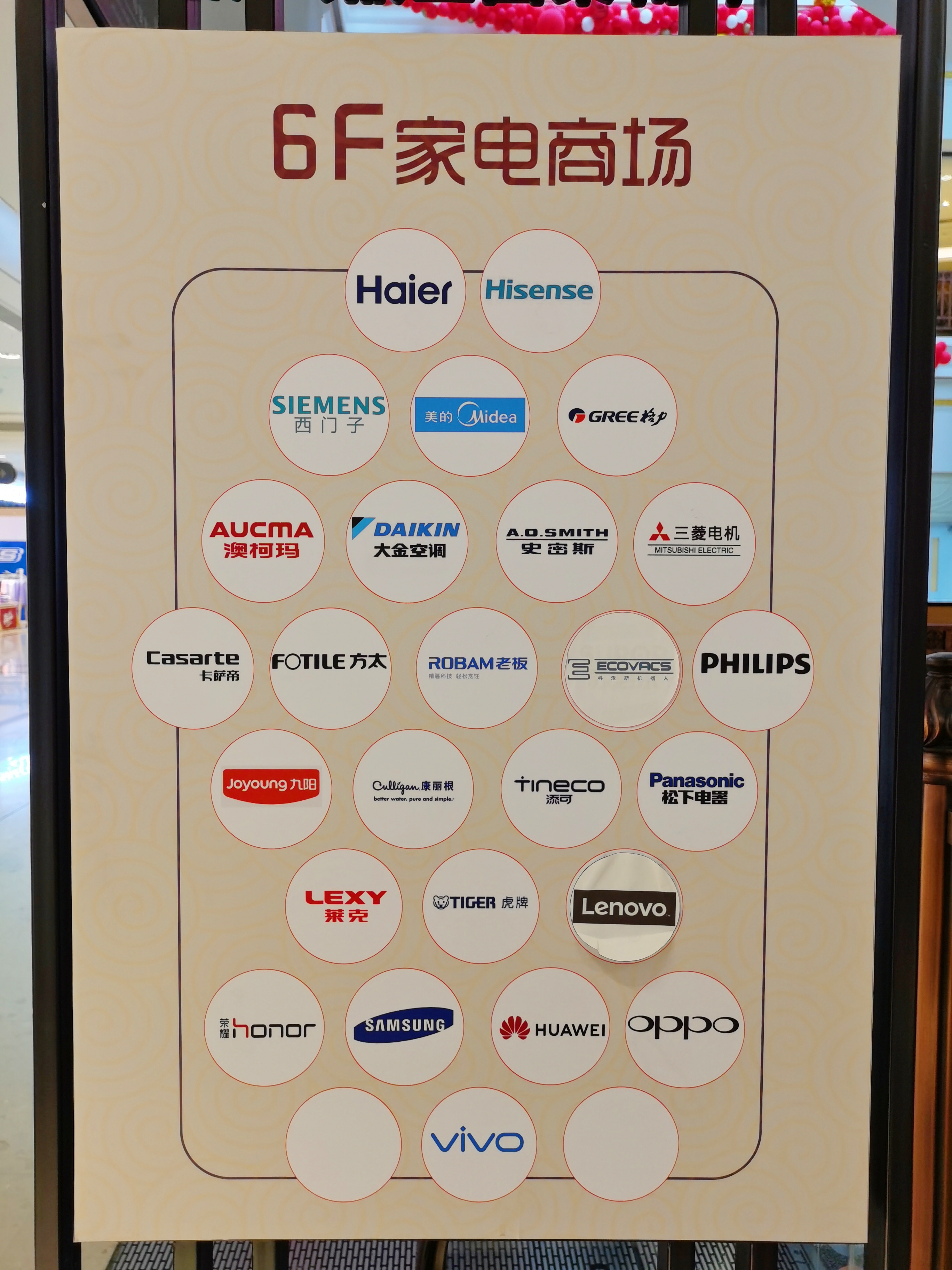 1层到5层依次是美妆珠宝、女装鞋履、儿童家居类、男装、书店、户外运动等类别。6层分为了家电区域和餐饮区域:其中家电区域品牌齐全,包含了海尔、海信等品牌;餐饮区域包含了佰烧海鲜烤肉自助、广德福猪肚鸡、粥全粥到、宽鲜锅贴、燃尖串物局。