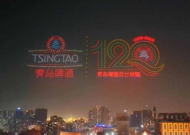 当夜幕降临,在青岛啤酒厂园区上方,1200架无人机腾空而起,以天为幕,以光为笔。随着飘逸的彩带蜿蜒构成“1903”到“2023”,以及“120”标识演绎为“旭日东升”“感恩百廿同行共创美好未来”等多个极具特色的造型依次闪耀出现,一幅幅瑰丽的光影画卷在天幕上铺开,描绘出青岛啤酒120年愿景,为市民和游客打造了一场视觉盛宴。
