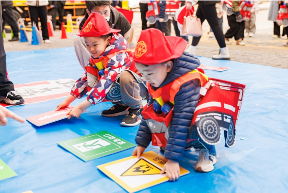活动现场哪个环节最受欢迎?“消防连连看”一定冲在话题榜首,小朋友们在消防员叔叔的指引下,有序的分成两组,穿上Cosplay服装变身成为小小“消防救援车”,通过寻找相同的消防安全标志来PK竞赛,在生动有趣的互动游戏中,认识和了解消防安全标志,深化并稳固消防安全意识。