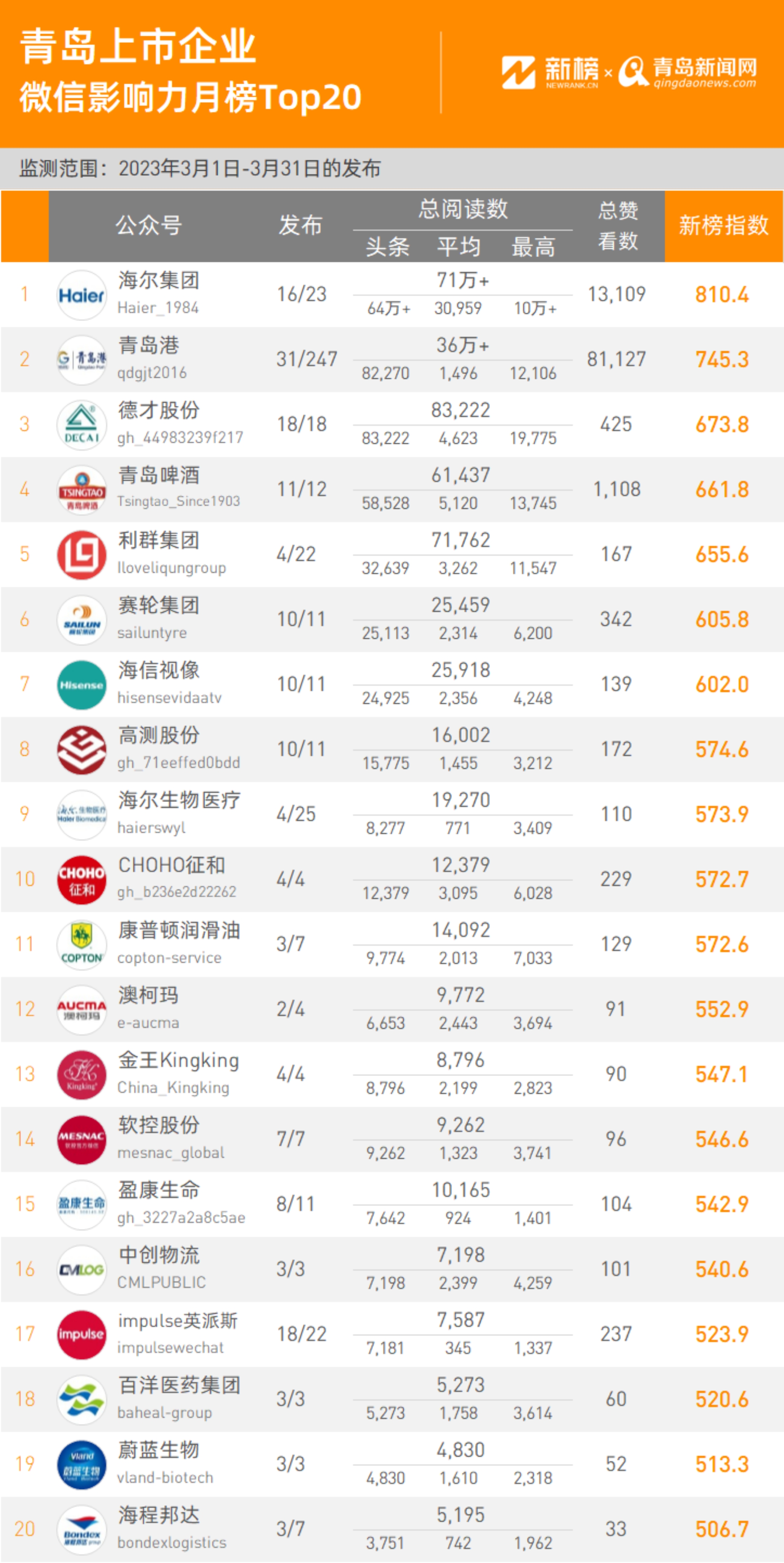 NO.1| 权威发布:青岛上市企业微信影响力月度排行榜TOP20