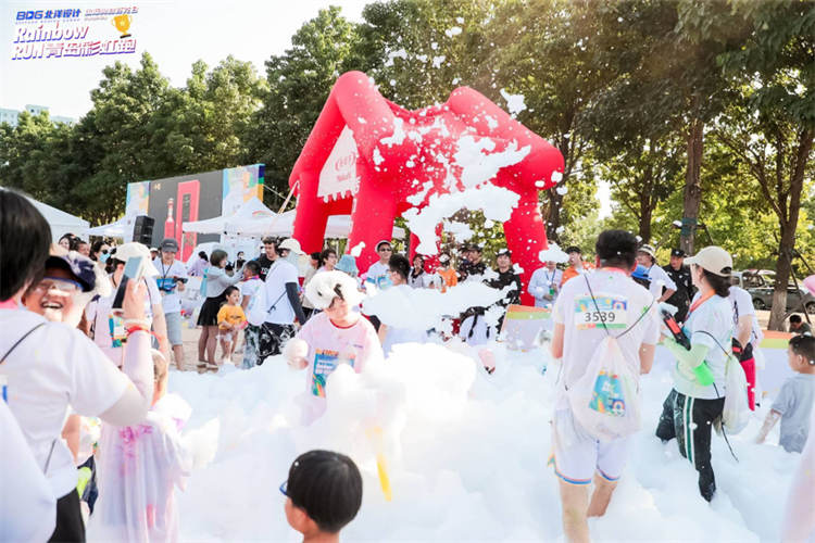 伴随着动感的音乐,水枪大战+电音派对同时开启,DJ与舞者带领全场一起嗨翻这一刻,大家把彩色玉米粉同时抛向空中,彩色的粉末随风飞舞,呐喊与欢呼交织,色彩与青春碰撞,汇聚成一道道绚烂无比的彩虹人潮。参赛者还不忘拿起水枪互相喷射,有人更是被众多人“围攻”,头发上、脸上都是不同的颜色,每个脸庞都像调色盘一样缤纷生动。更有巨型“泡泡枪”将超多白色泡沫喷向空中,瞬间把狂欢气氛推向高潮。大人与小孩都在洁白细腻的泡沫里穿梭翻滚,欢乐的笑脸与笑声连成片,千余人一起洗泡泡浴,这样的体验可是非常难得的,相信这快乐又神奇的时刻将深深印在每个人的脑海里。