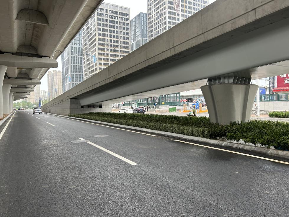 继南半幅地下通道端午节前通车后,辽阳路快速路(福州路-海尔路段)工程桥下辅路全线沥青摊铺也于日前完成。自2022年年底主线桥通车后,青岛地铁第一建设分公司仅用6个月时间完成了匝道桥及2.5公里桥下辅路的施工,实现了辽阳路工程桥下辅路的顺利贯通(下图),比计划通车时间提前了5个月。