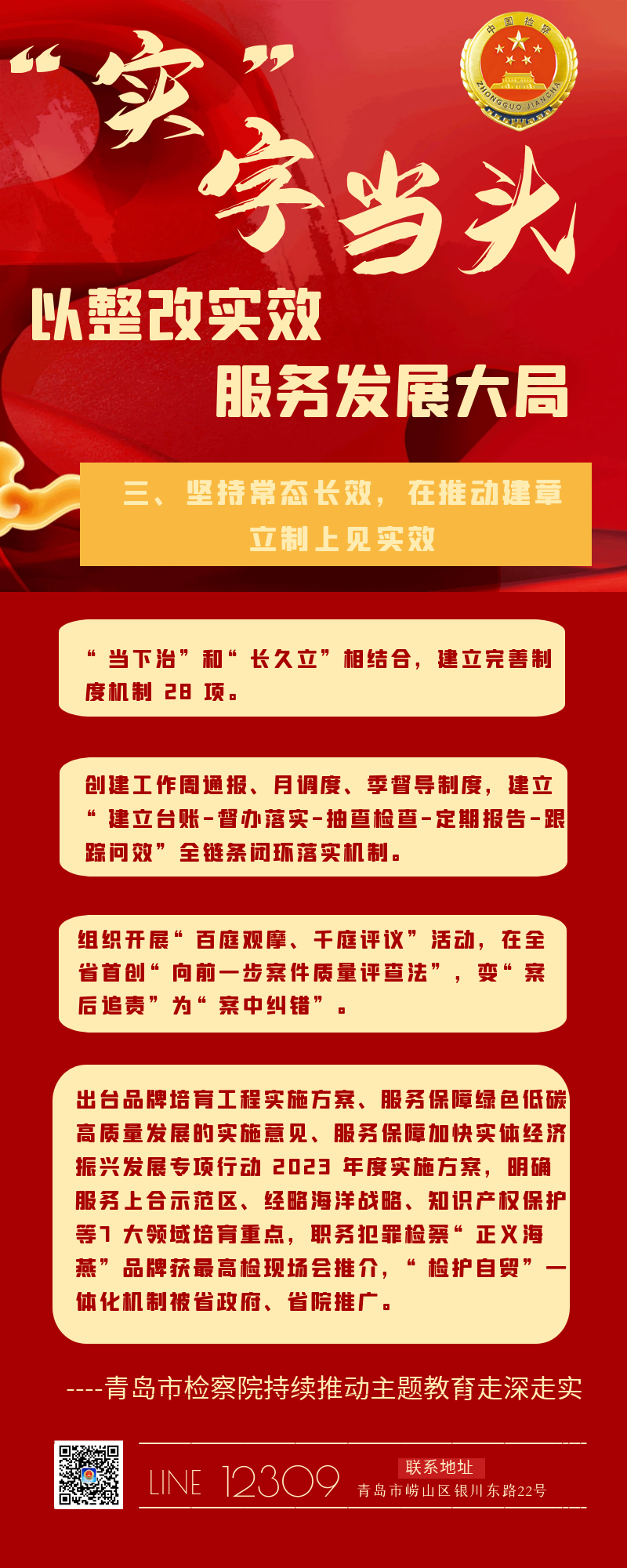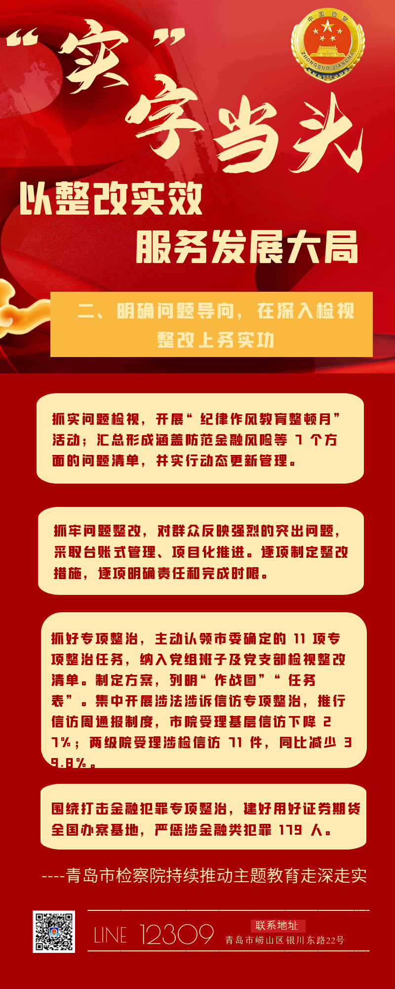 主题教育开展以来,青岛市检察院按照习近平总书记“把问题整改贯穿主题教育始终,让人民群众切实感受到解决问题的实际成效”的指示要求,全面贯彻落实中央主题教育整改整治工作推进会精神,以整改整治解难题、促发展,取得明显成效。
