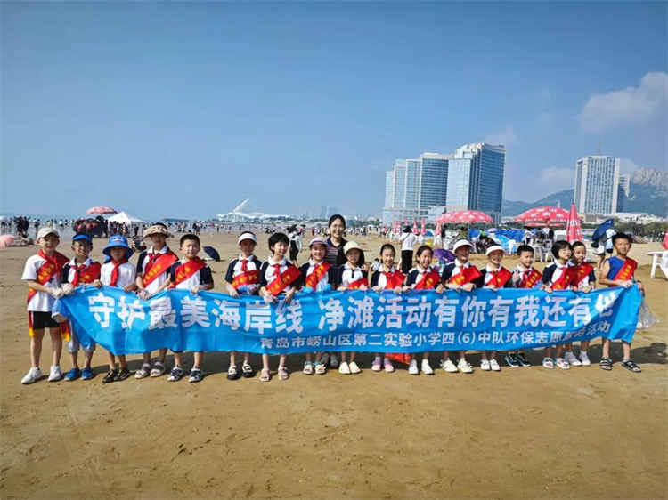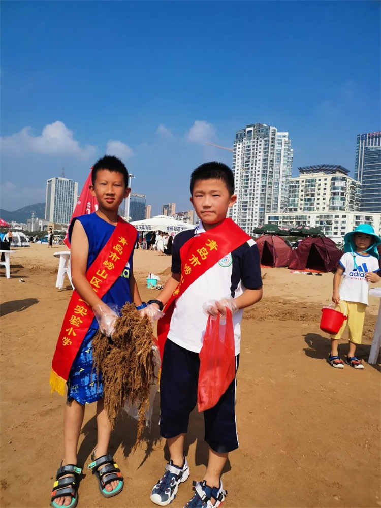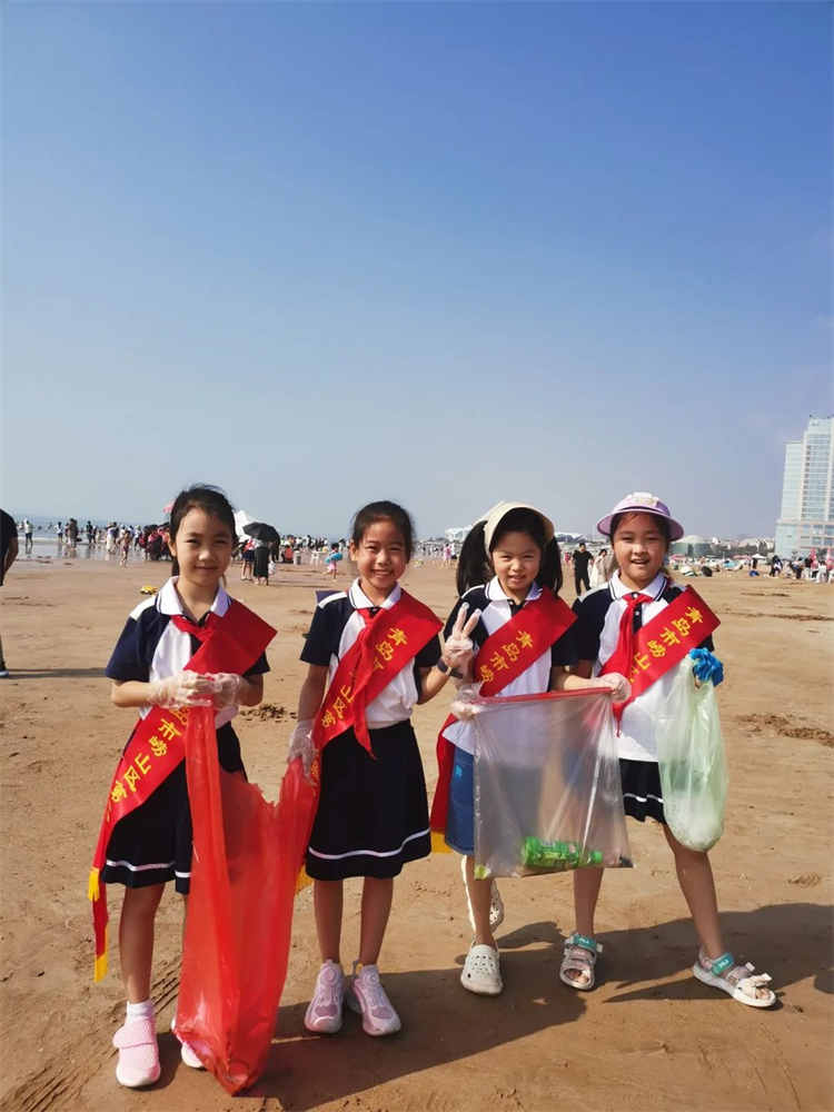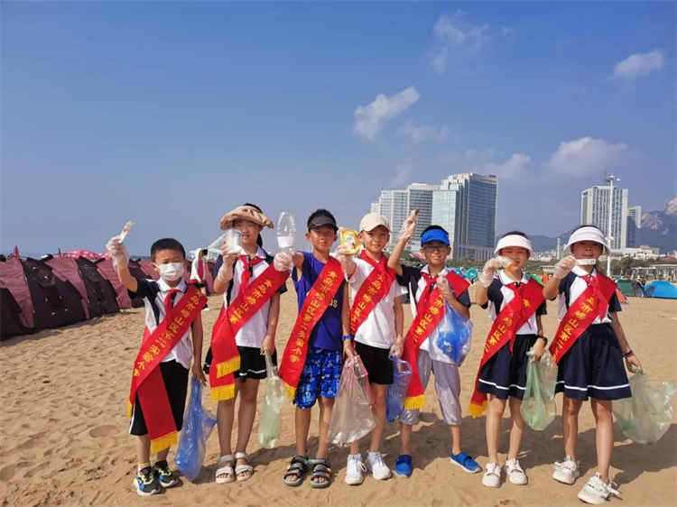 队员们来到石老人海水浴场,自发分成五组,划分捡垃圾的范围。携带不同颜色的塑料袋,不一会功夫就将一大片海滩上的垃圾捡拾完毕,并进行分类汇总。他们头上冒着汗珠,脸上却绽放出发自内心的笑容。在这场实践活动中队员们践行了垃圾分类的绿色理念,付出了劳动,不仅洁净了石老人海水浴场,更重要的是加强了自身环保意识并了解到付出比得到更容易收获快乐。