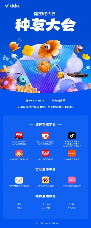 8月26日是Vidda一年一度的品牌日。日前,Vidda举办“你的伟大日——Vidda 8.26种草大会“,邀请上百位时尚达人现场种草。作为海信旗下的年轻潮牌,Vidda在2021年8月26日成功实现了品牌升级;2022年的8月26日,新晋网红CP主持人yoyo和颢鑫将“yo一说一”访谈节目现场搬到Vidda直播室。“一切伟大,都始于平凡和微小”,经过三个年头,Vidda已经成为近年成长最快的互联网科技品牌。