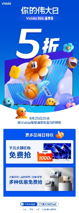 同时,除了线上发布会直播,Vidda电商渠道也为消费者准备了丰厚福利!8月25日-8月31日,Vidda品牌将在京东、淘宝、抖音官方旗舰店开展丰富多样的福利活动。25日20点起,指定产品5折特权、千元大额红包免费抢、整点抽大额限量代金券、送百元京东E卡、送投影支架、送视频月卡……将陆续上线,花式活动迎接“伟大日”,详情可关注Vidda天猫、京东、抖音旗舰店等渠道,随时获取最新活动信息。