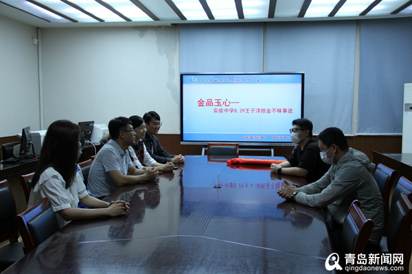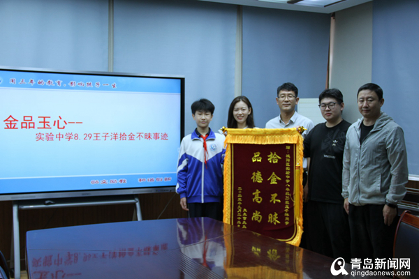 青岛新闻网9月26日讯(记者 任俊峰)9月25日,青岛市城阳区实验中学明德楼二楼会议室召开一场特别的表彰会,失主曹先生将绣有“拾金不昧,品德高尚”的锦旗送到城阳区实验中学八年级二十九班王子洋同学手中,对他拾金不昧的暖心善举以示感谢。