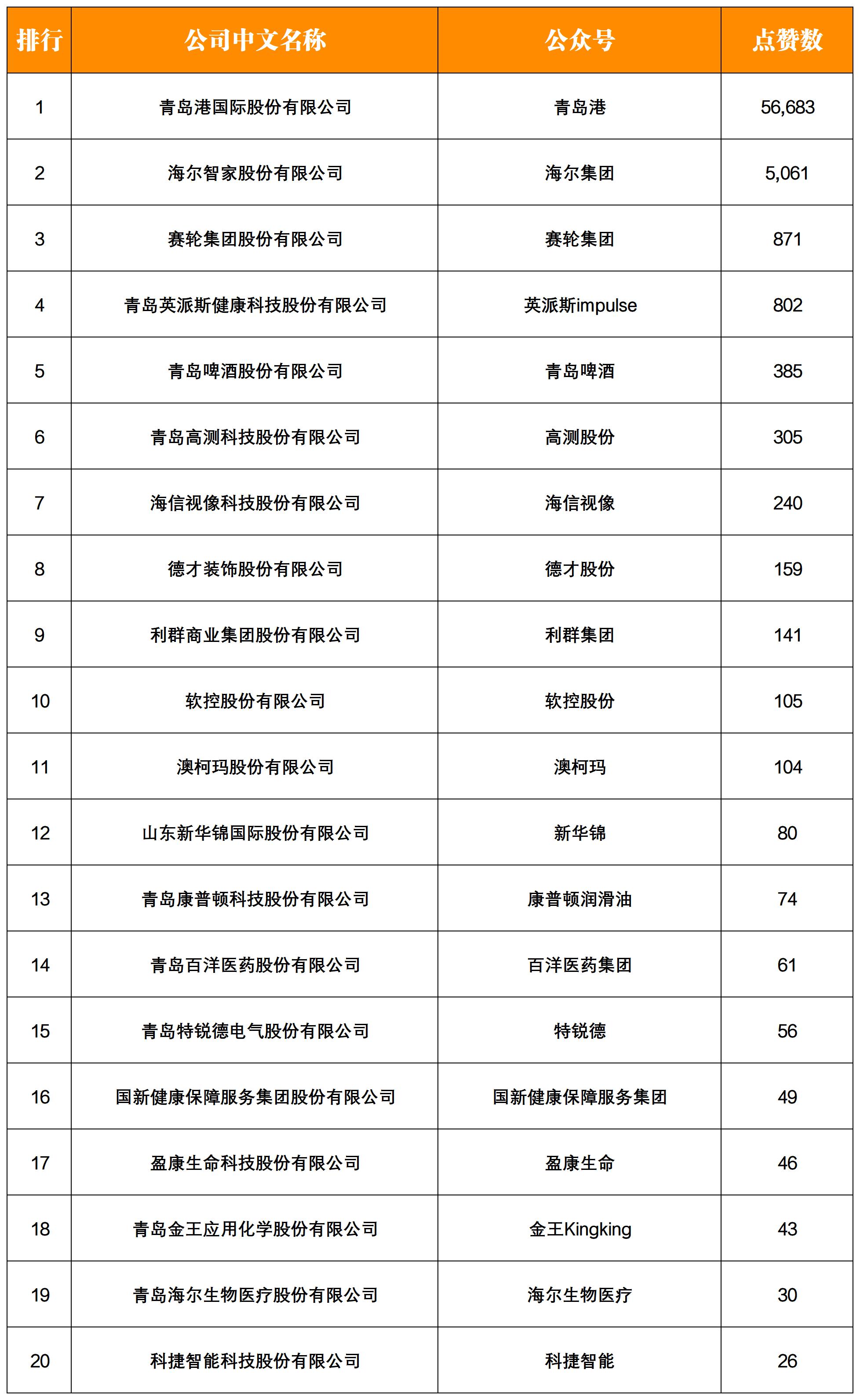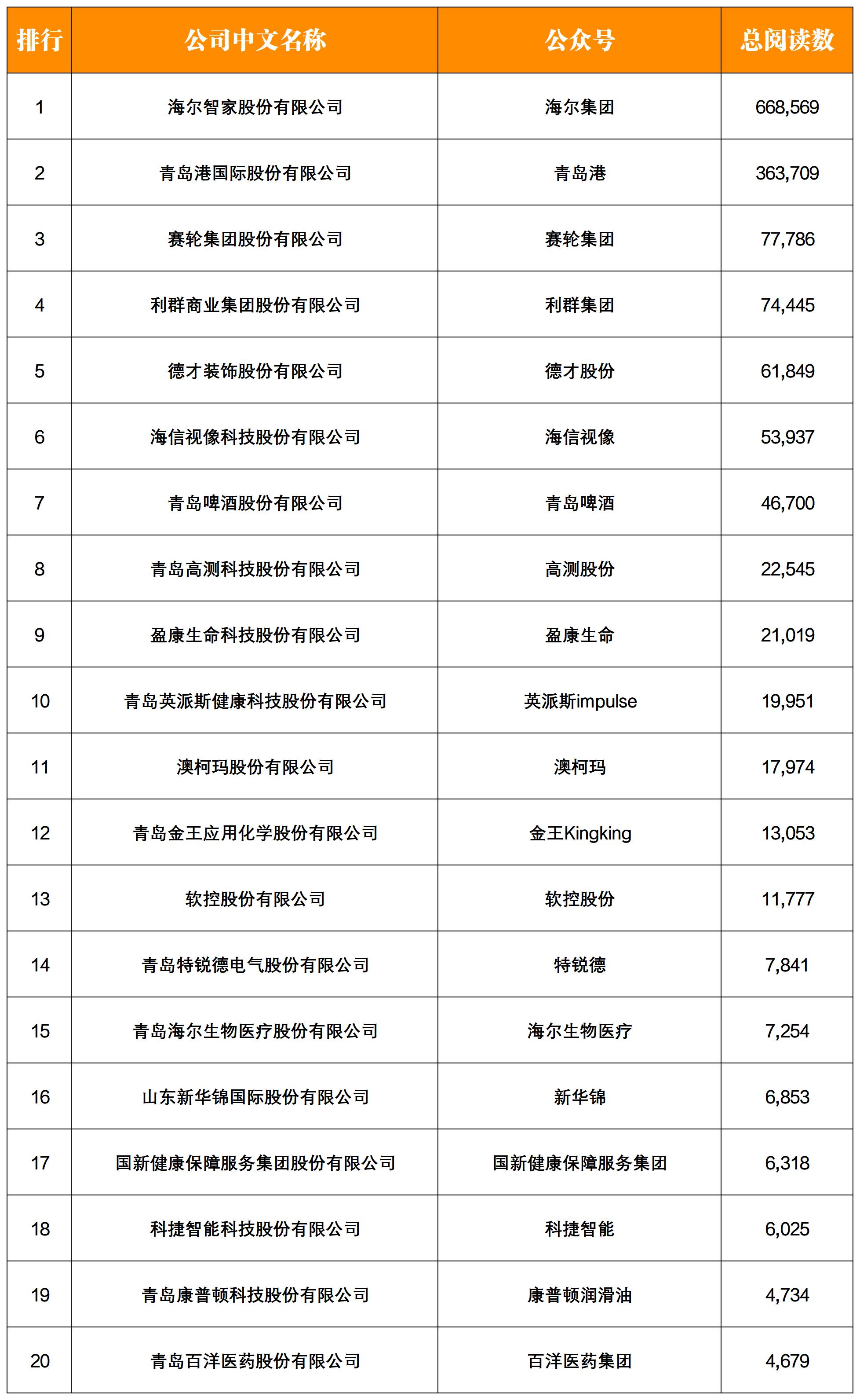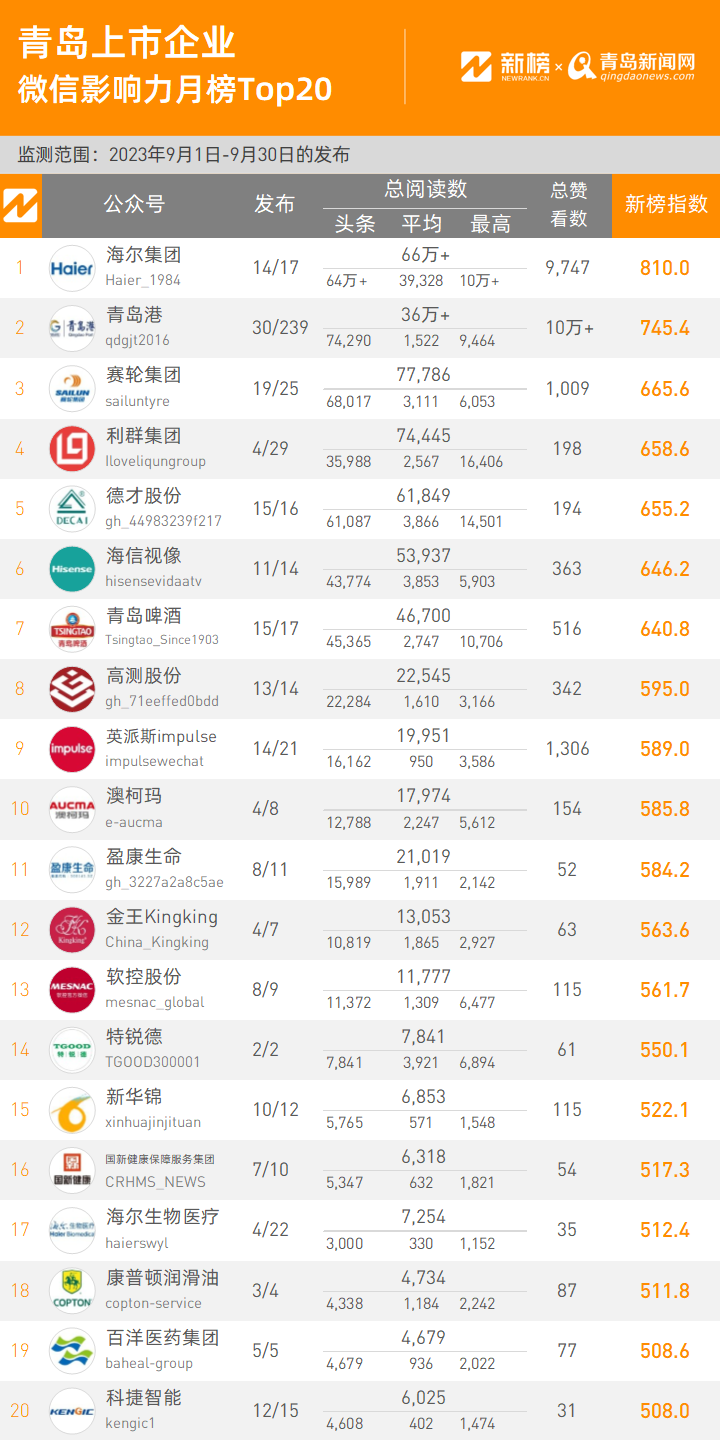 NO.1| 权威发布:青岛上市企业微信影响力月度排行榜TOP20