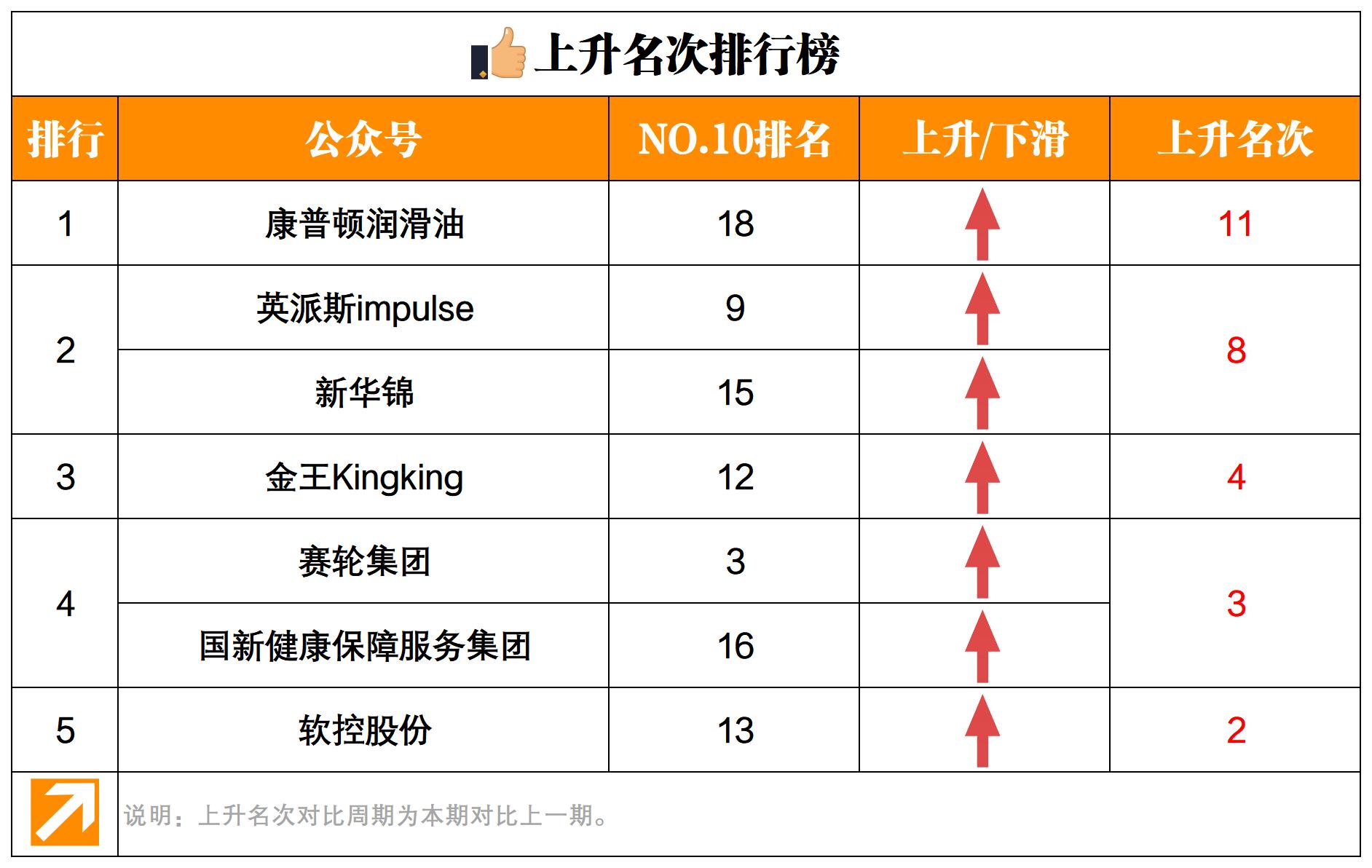 上升名次排行榜排名每一期浮动都较大,本期前五名分别是:“康普顿润滑油”、“英派斯impulse”和“新华锦”、“金王Kingking”、“赛轮集团”和“国新健康保障服务集团”、“软控股份”。