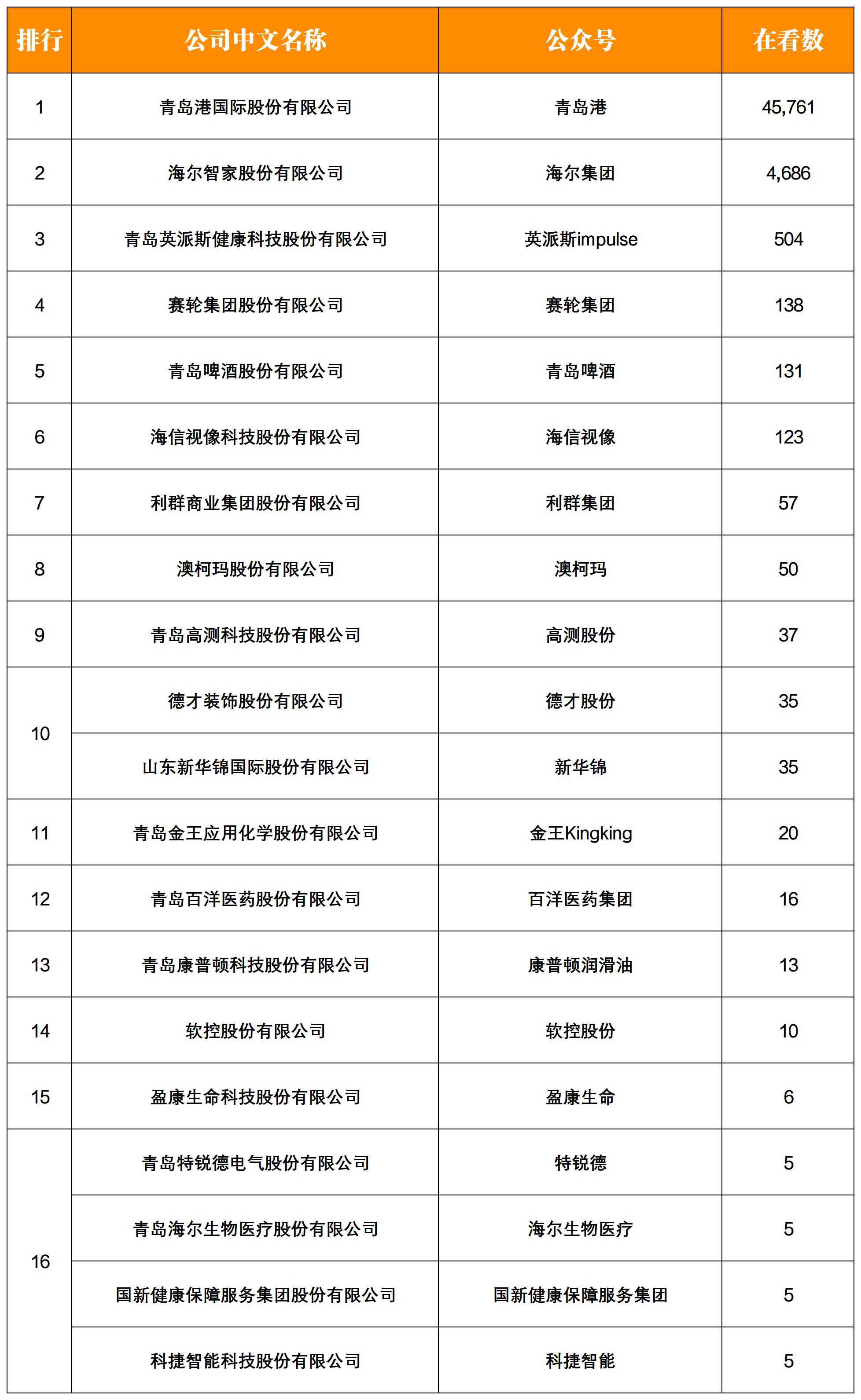 感谢您的关注!本次榜单收录了大部分的青岛上市公司类微信公众号,如您的账号暂未收录或者账号有出入,可电话咨询:13475323886。