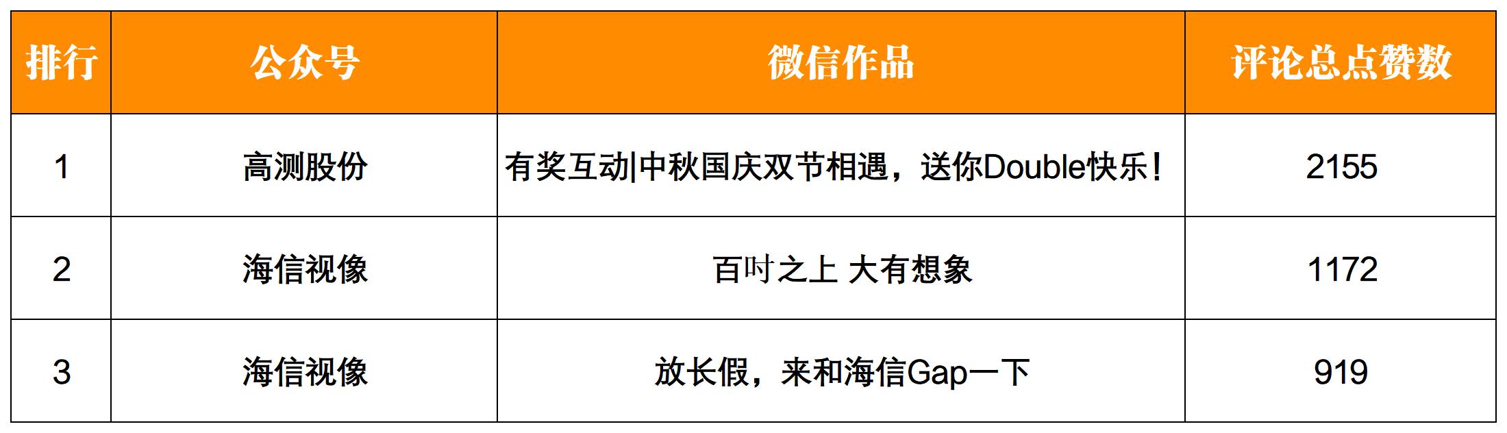 本期单篇作品最高评论总点赞数2155,出自账号“高测股份”;排行第二篇、第三篇推文均出自于账号“海信视像”,评论总点赞数分别为1172和919,我们来看下出彩的作品: