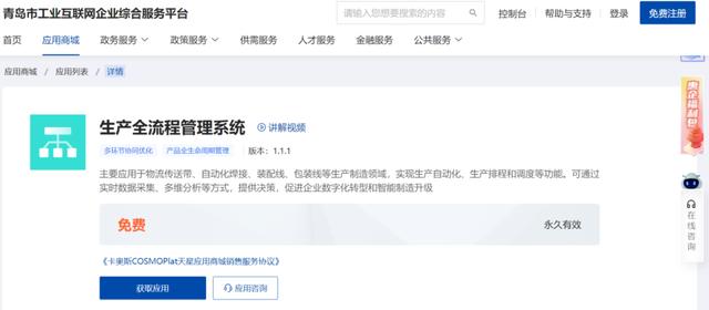 作为首个“政企共建、市场化运作”的综合服务平台,青岛市工业互联网企业综合服务平台由青岛市携手卡奥斯COSMOPlat共同建设,围绕政策、供需、人才、金融等企业数字化转型中的各项需求,构建起覆盖企业全生命周期的服务体系。其中,“应用商城”板块兼顾行业共性与企业个性需求,为企业提供SaaS化应用服务。企业只需要通过网络浏览器或专用应用程序就可以访问和使用软件,实现云上管理。