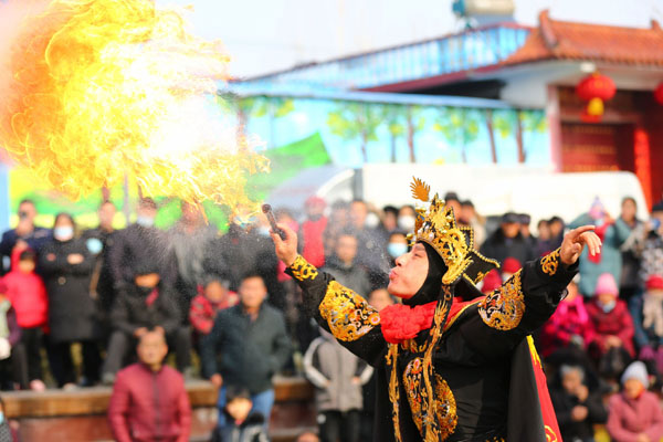 民间艺人在山东省滕州市西岗镇表演“喷火”绝活。新华社发(李志军 摄)