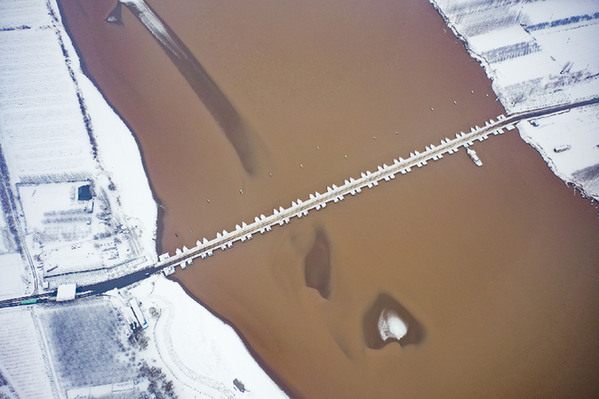 这是山东省邹平市台子镇的黄河浮桥雪景(无人机照片)。新华社发(董乃德 摄)