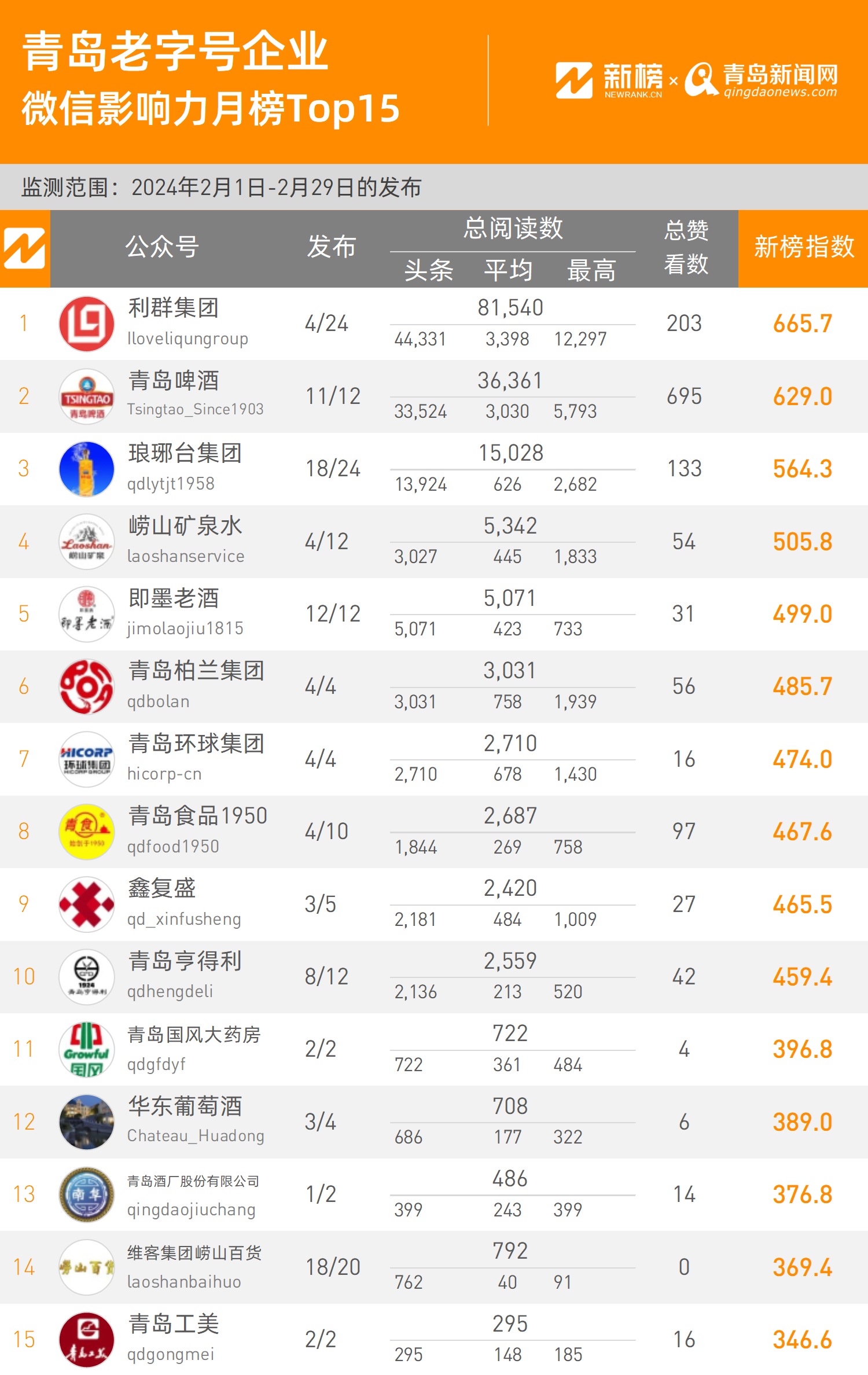 2024年2月青岛老字号企业微信影响力排行榜TOP15即刻揭晓。本期榜单统计周期是2024年2月1日到2024年2月29日。