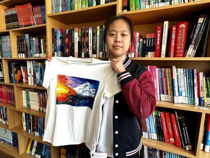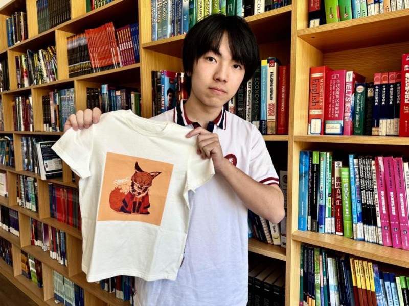 梅尔顿国际学校学生林相儒手持自己原创画作的T恤衫