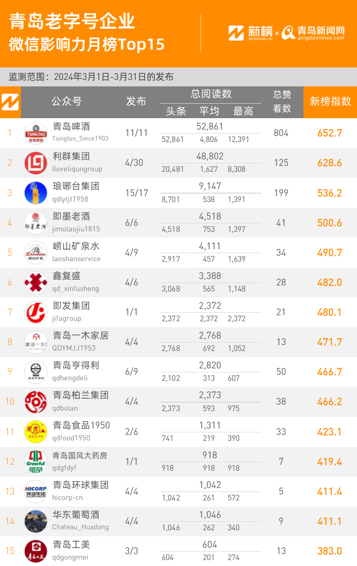 2024年3月青岛老字号企业微信影响力排行榜TOP15即刻揭晓。本期榜单统计周期是2024年3月1日到2024年3月31日。