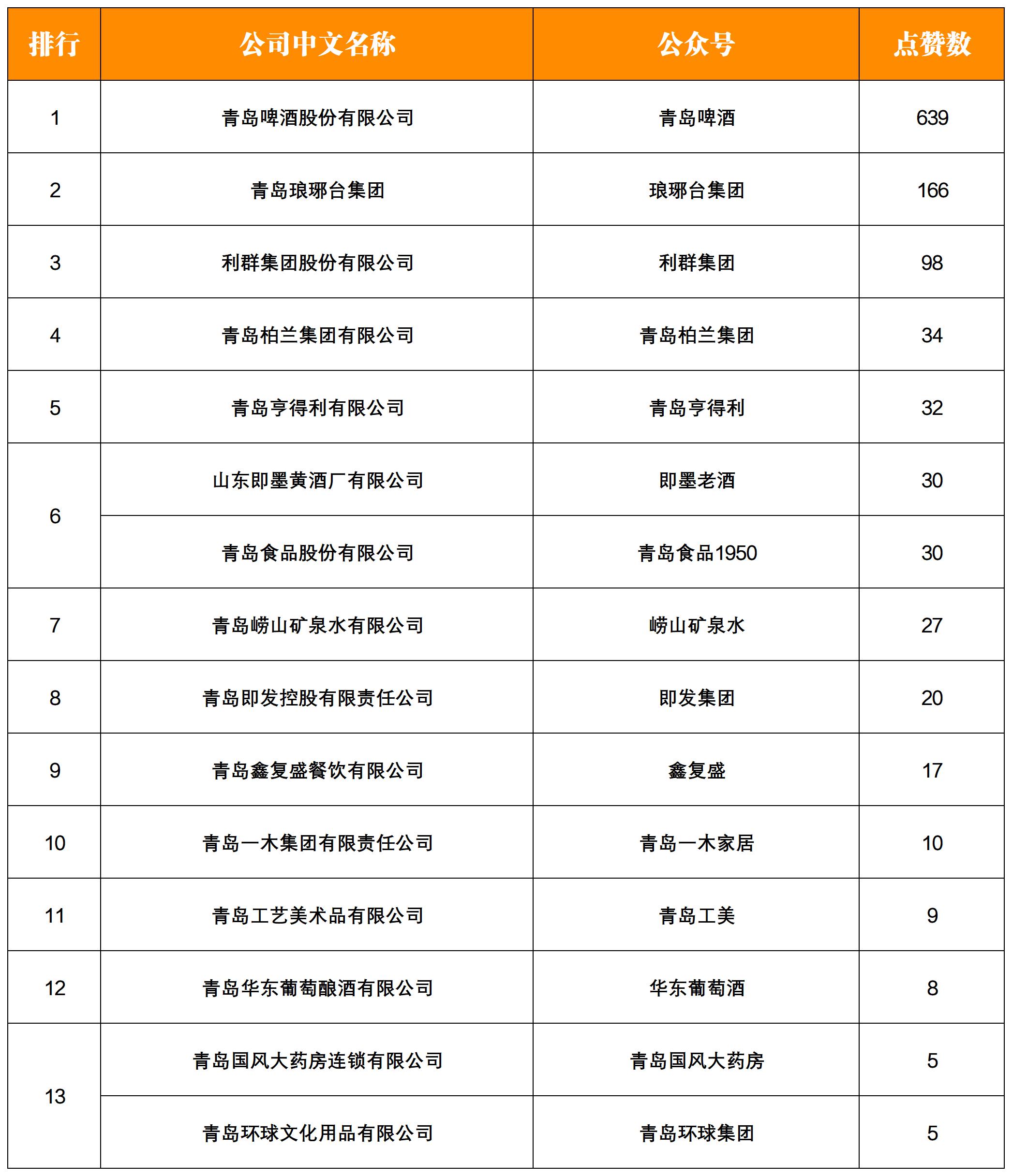感谢您的关注!本次榜单收录了大部分的青岛老字号企业类微信公众号,如您的账号暂未收录或者账号有出入,可电话咨询:13475323886。